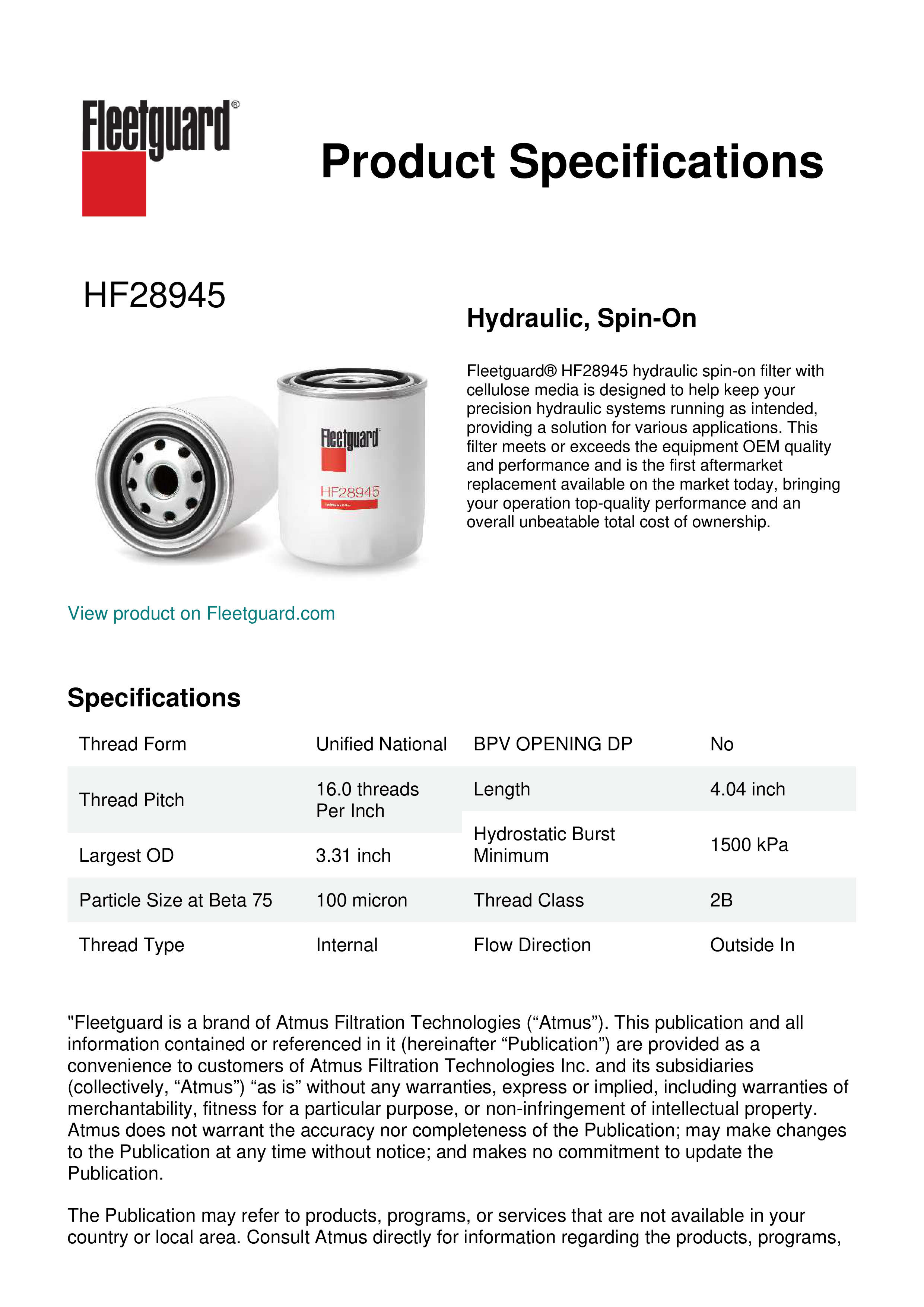 Fleetguard® HF28945 hydraulic spin-on filter with cellulose media is designed to help keep your precision hydraulic systems running as intended, providing a solution for various applications. This filter meets or exceeds the equipment OEM quality and performance and is the first aftermarket replacement available on the market today, bringing your operation top-quality performance and an overall unbeatable total cost of ownership.Specification