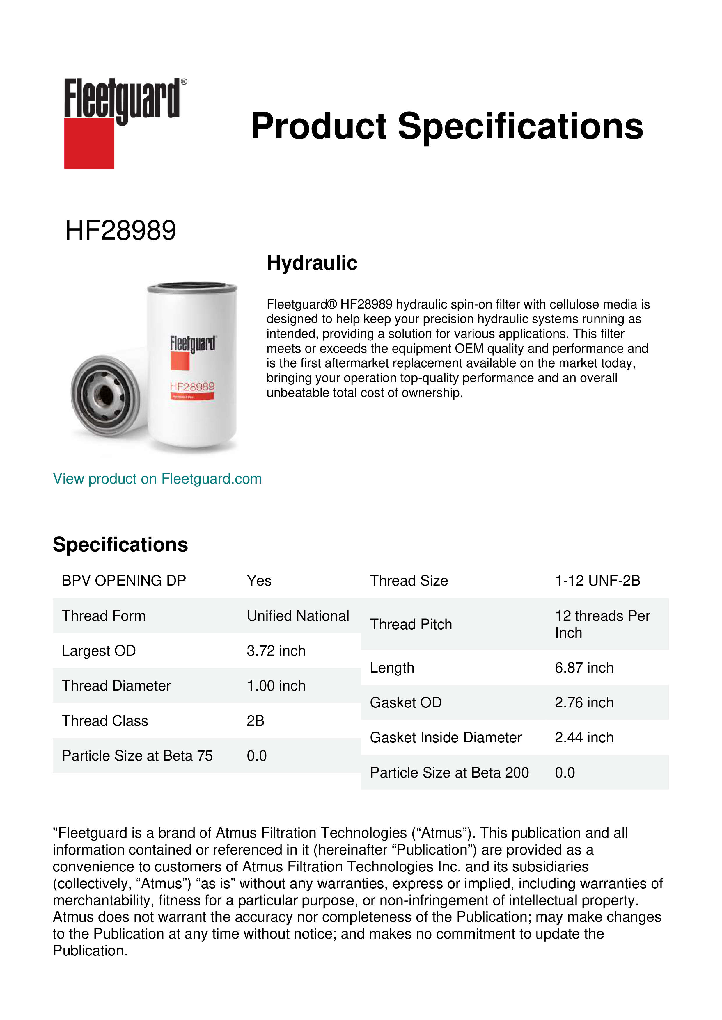 Fleetguard® HF28989 hydraulic spin-on filter with cellulose media is designed to help keep your precision hydraulic systems running as intended, providing a solution for various applications. This filter meets or exceeds the equipment OEM quality and performance and is the first aftermarket replacement available on the market today, bringing your operation top-quality performance and an overall unbeatable total cost of ownership.Specification