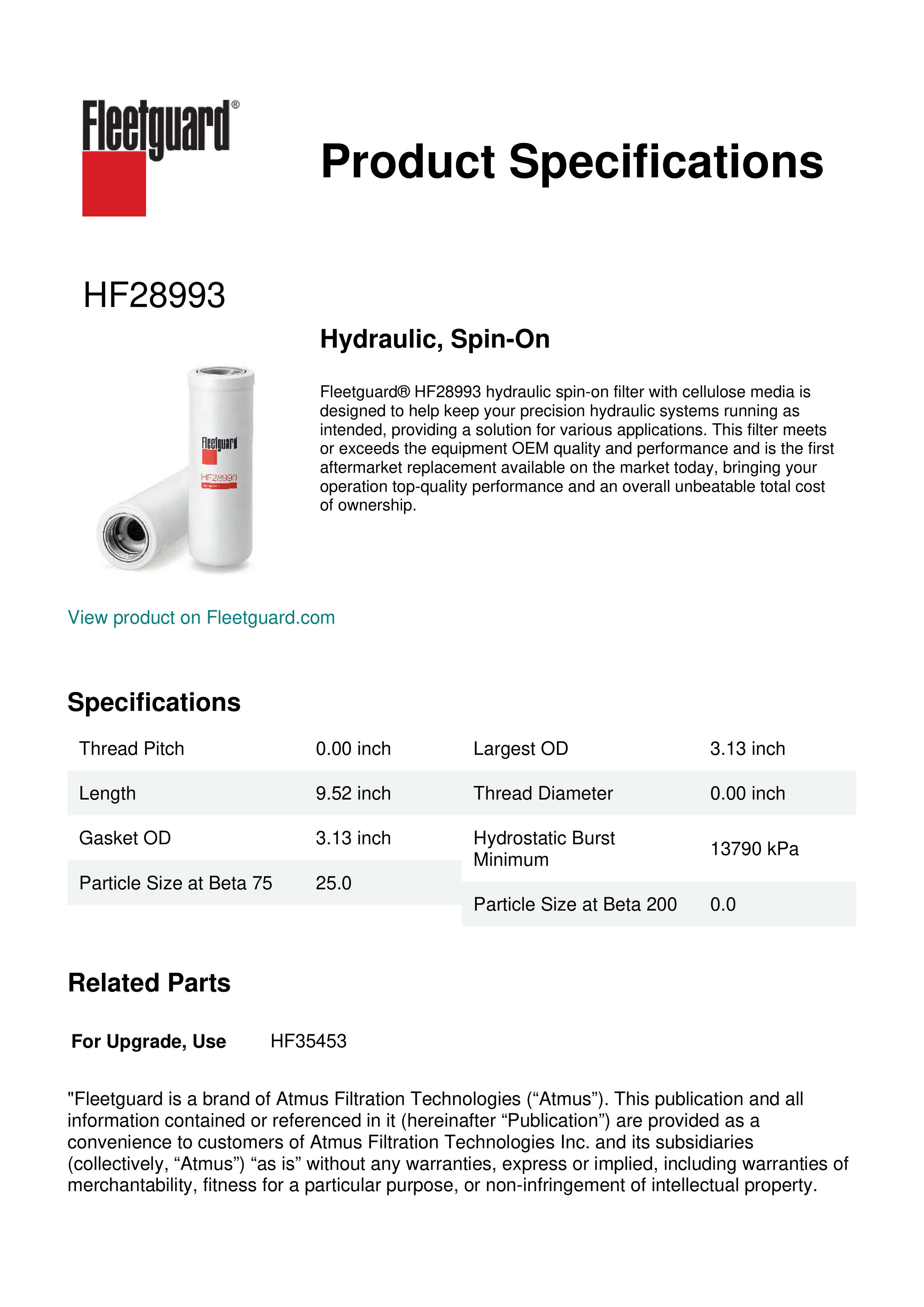 Fleetguard® HF28993 hydraulic spin-on filter with cellulose media is designed to help keep your precision hydraulic systems running as intended, providing a solution for various applications. This filter meets or exceeds the equipment OEM quality and performance and is the first aftermarket replacement available on the market today, bringing your operation top-quality performance and an overall unbeatable total cost of ownership.Specification