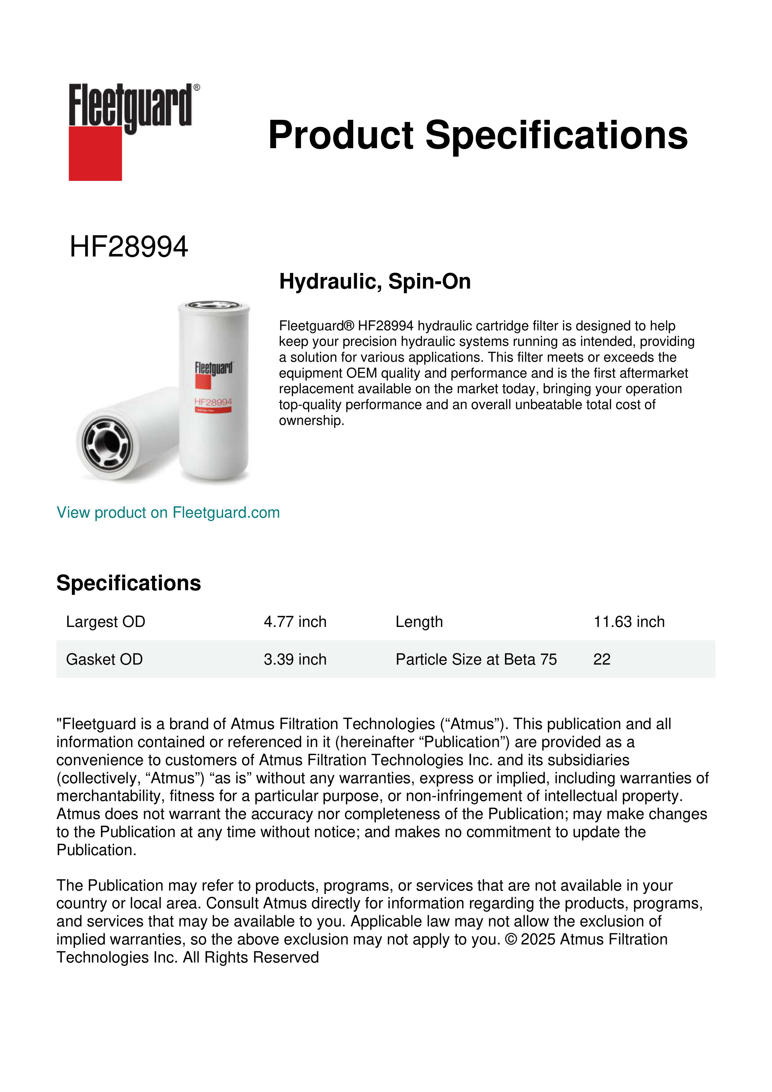 Fleetguard® HF28994 hydraulic cartridge filter is designed to help keep your precision hydraulic systems running as intended, providing a solution for various applications. This filter meets or exceeds the equipment OEM quality and performance and is the first aftermarket replacement available on the market today, bringing your operation top-quality performance and an overall unbeatable total cost of ownership.Specification