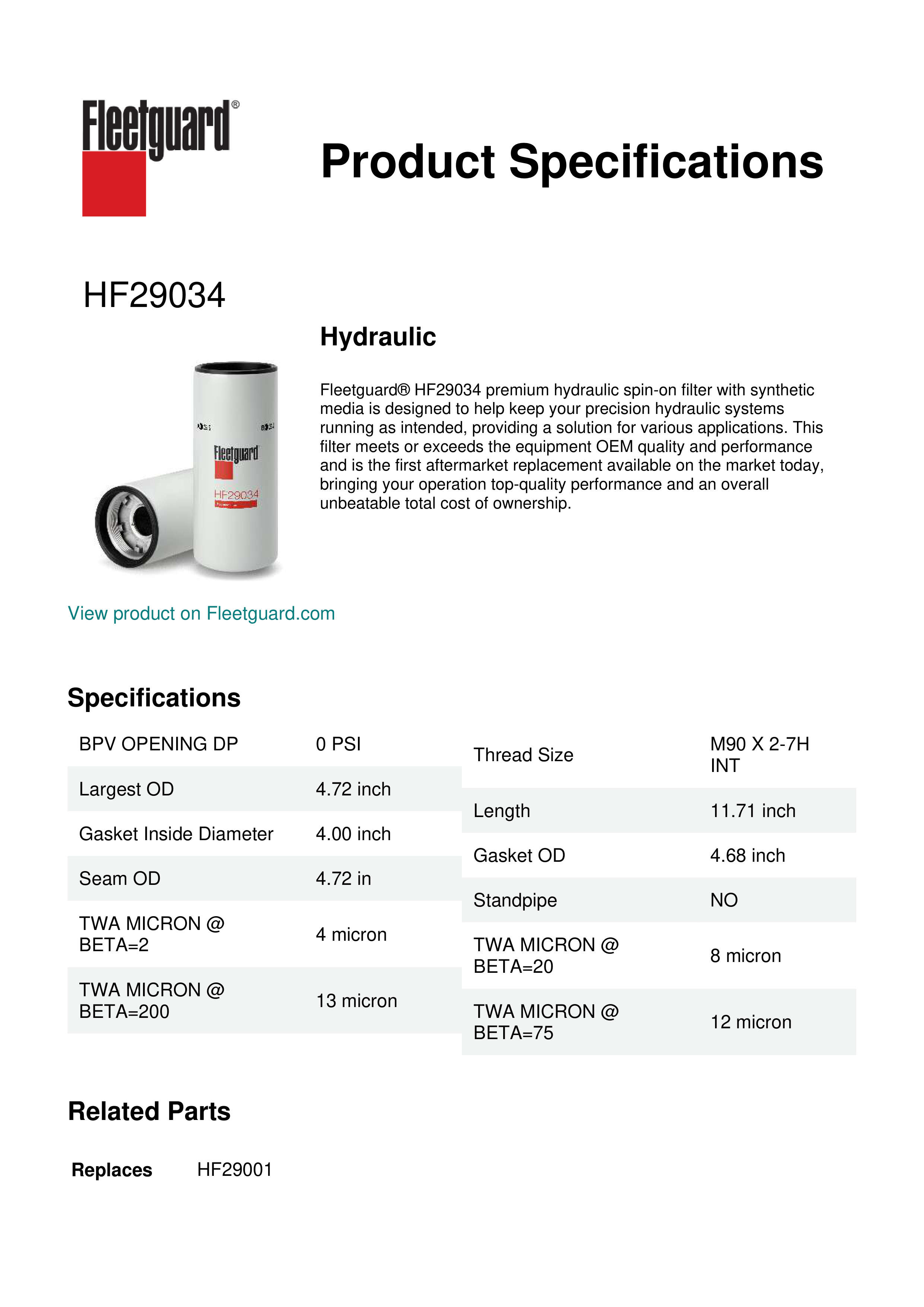 Fleetguard® HF29034 premium hydraulic spin-on filter with synthetic media is designed to help keep your precision hydraulic systems running as intended, providing a solution for various applications. This filter meets or exceeds the equipment OEM quality and performance and is the first aftermarket replacement available on the market today, bringing your operation top-quality performance and an overall unbeatable total cost of ownership.Specification