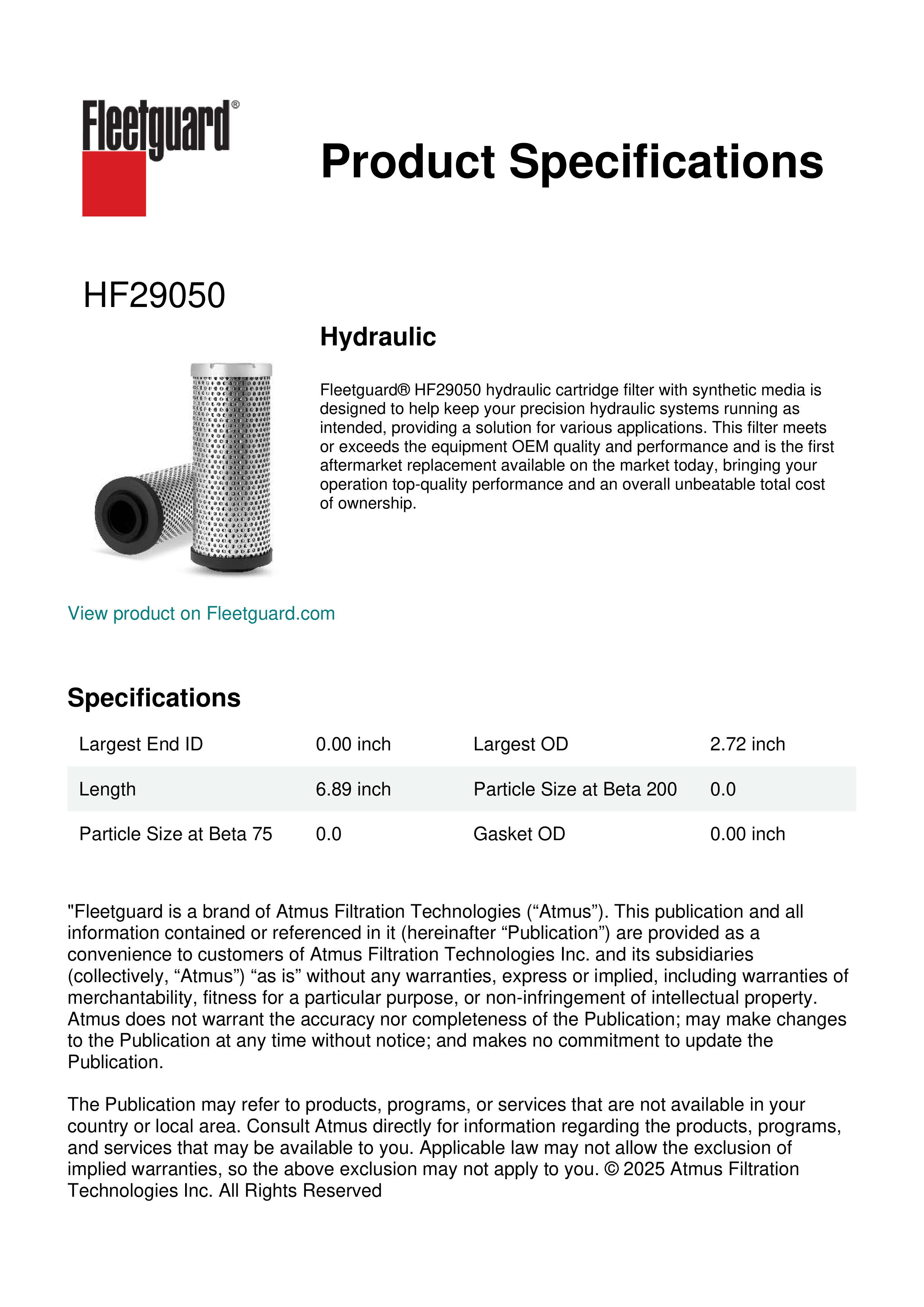 Fleetguard® HF29050 hydraulic cartridge filter with synthetic media is designed to help keep your precision hydraulic systems running as intended, providing a solution for various applications. This filter meets or exceeds the equipment OEM quality and performance and is the first aftermarket replacement available on the market today, bringing your operation top-quality performance and an overall unbeatable total cost of ownership.Specification