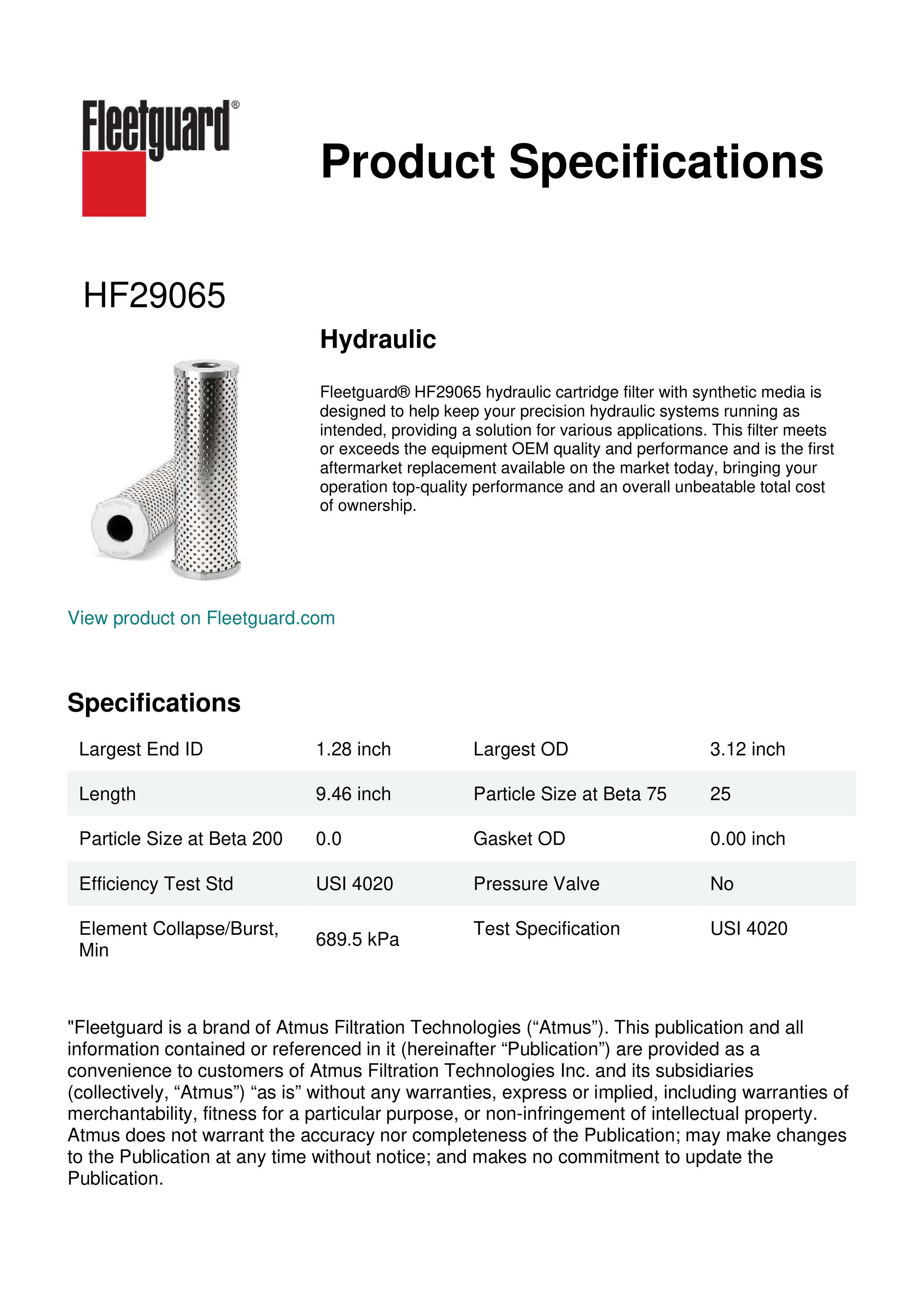 Fleetguard® HF29065 hydraulic cartridge filter with synthetic media is designed to help keep your precision hydraulic systems running as intended, providing a solution for various applications. This filter meets or exceeds the equipment OEM quality and performance and is the first aftermarket replacement available on the market today, bringing your operation top-quality performance and an overall unbeatable total cost of ownership.Specification