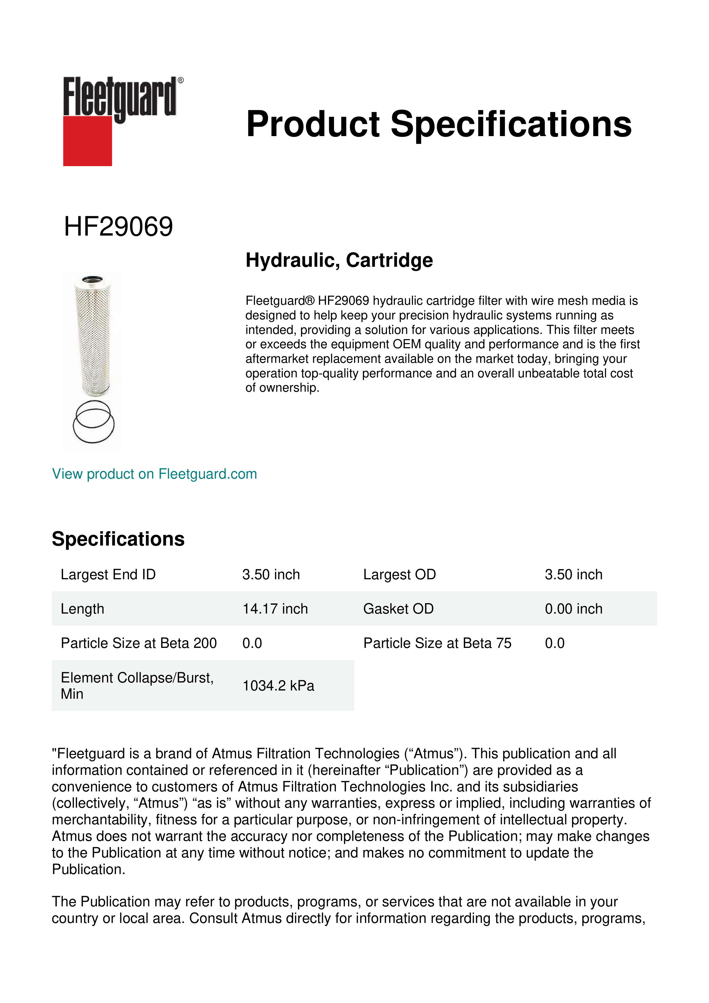 Fleetguard® HF29069 hydraulic cartridge filter with wire mesh media is designed to help keep your precision hydraulic systems running as intended, providing a solution for various applications. This filter meets or exceeds the equipment OEM quality and performance and is the first aftermarket replacement available on the market today, bringing your operation top-quality performance and an overall unbeatable total cost of ownership.Specification