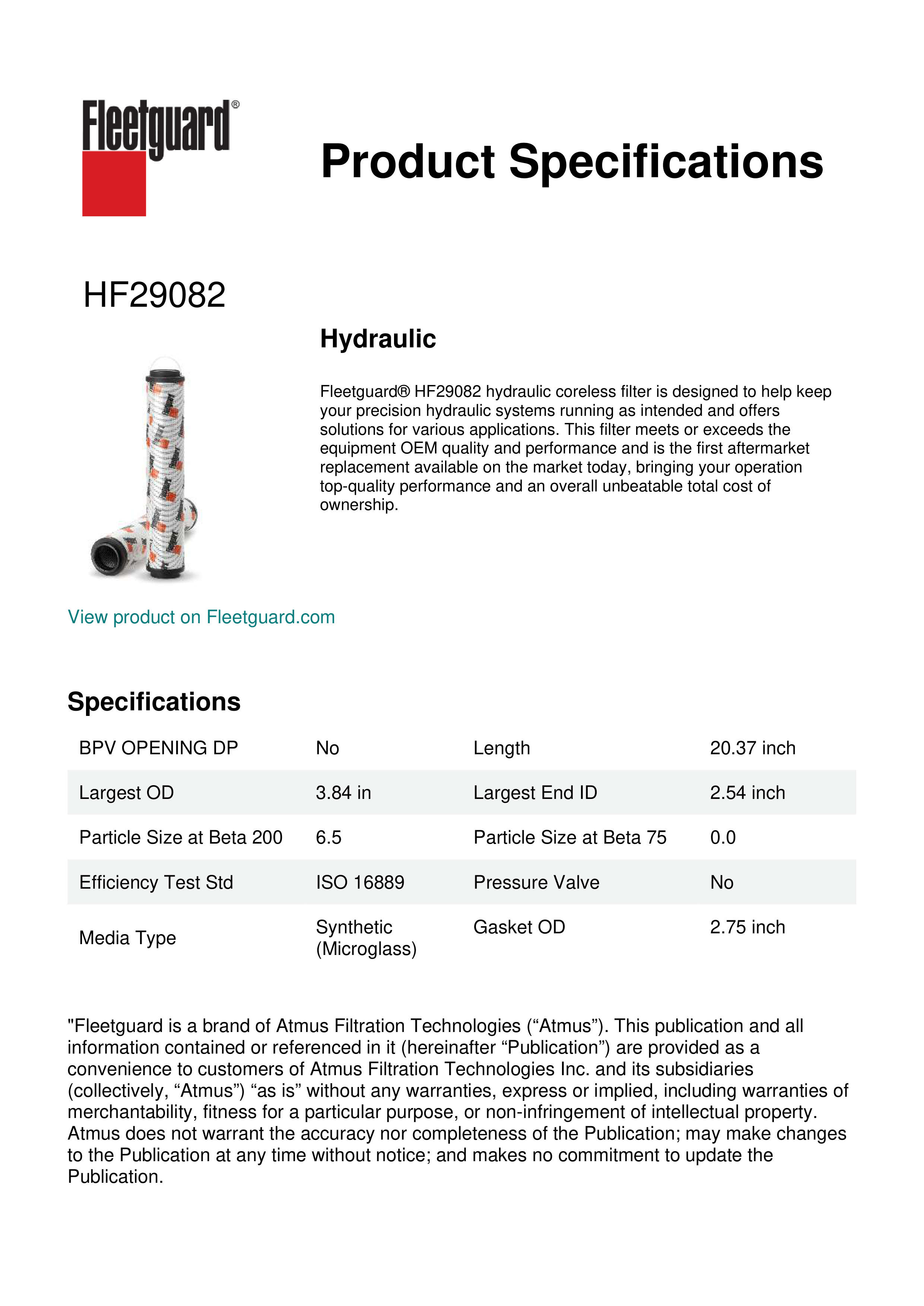Fleetguard® HF29082 hydraulic coreless filter is designed to help keep your precision hydraulic systems running as intended and offers solutions for various applications. This filter meets or exceeds the equipment OEM quality and performance and is the first aftermarket replacement available on the market today, bringing your operation top-quality performance and an overall unbeatable total cost of ownership.Specification