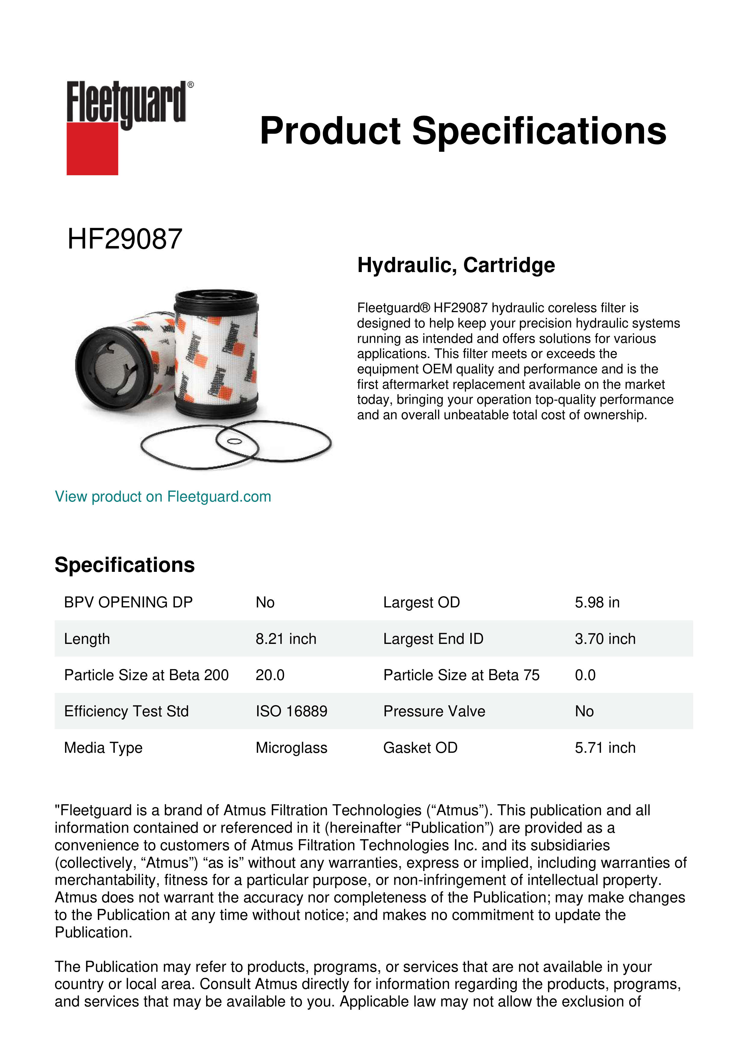 Fleetguard® HF29087 hydraulic coreless filter is designed to help keep your precision hydraulic systems running as intended and offers solutions for various applications. This filter meets or exceeds the equipment OEM quality and performance and is the first aftermarket replacement available on the market today, bringing your operation top-quality performance and an overall unbeatable total cost of ownership.