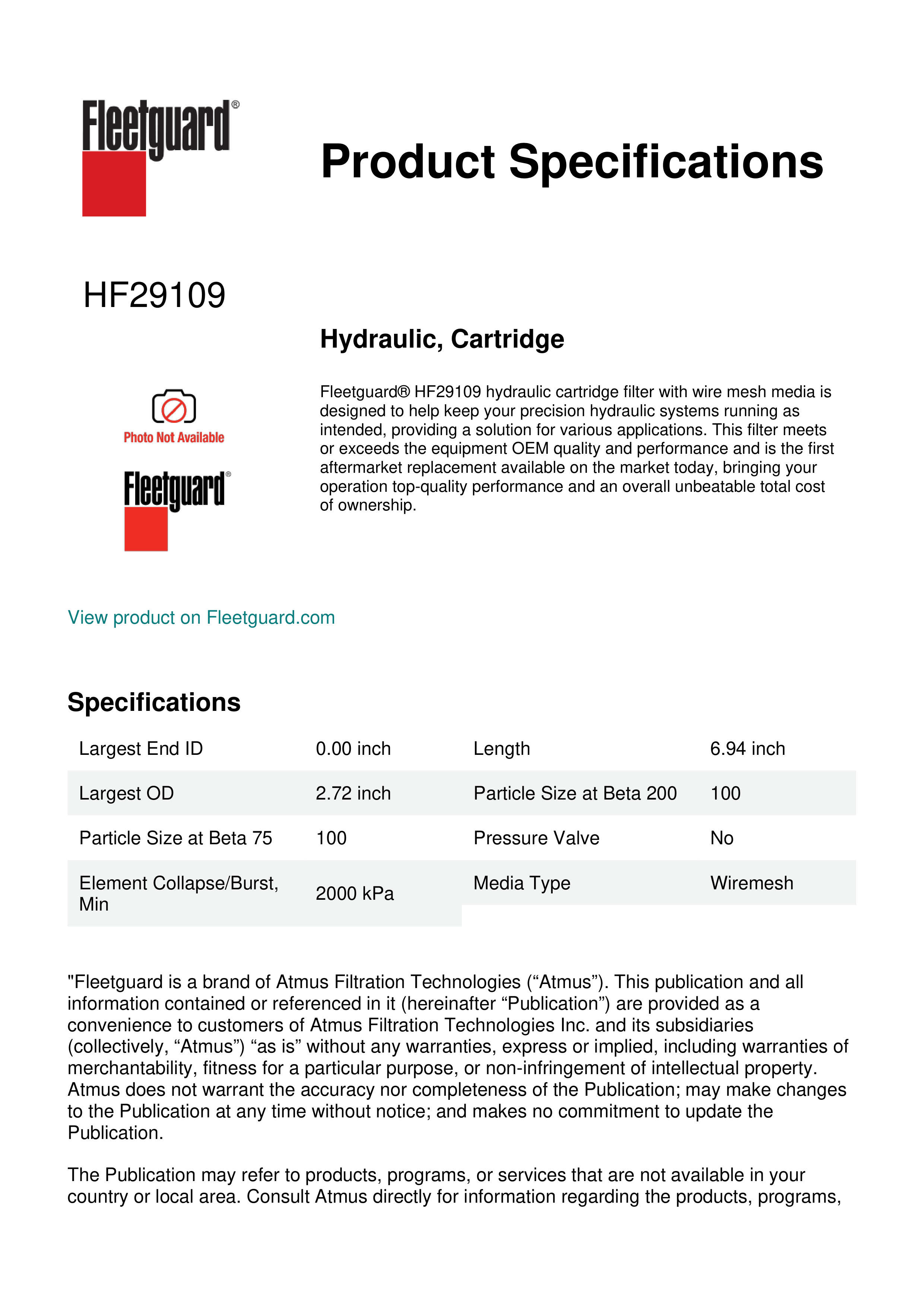 Fleetguard® HF29109 hydraulic cartridge filter with wire mesh media is designed to help keep your precision hydraulic systems running as intended, providing a solution for various applications. This filter meets or exceeds the equipment OEM quality and performance and is the first aftermarket replacement available on the market today, bringing your operation top-quality performance and an overall unbeatable total cost of ownership.Specification