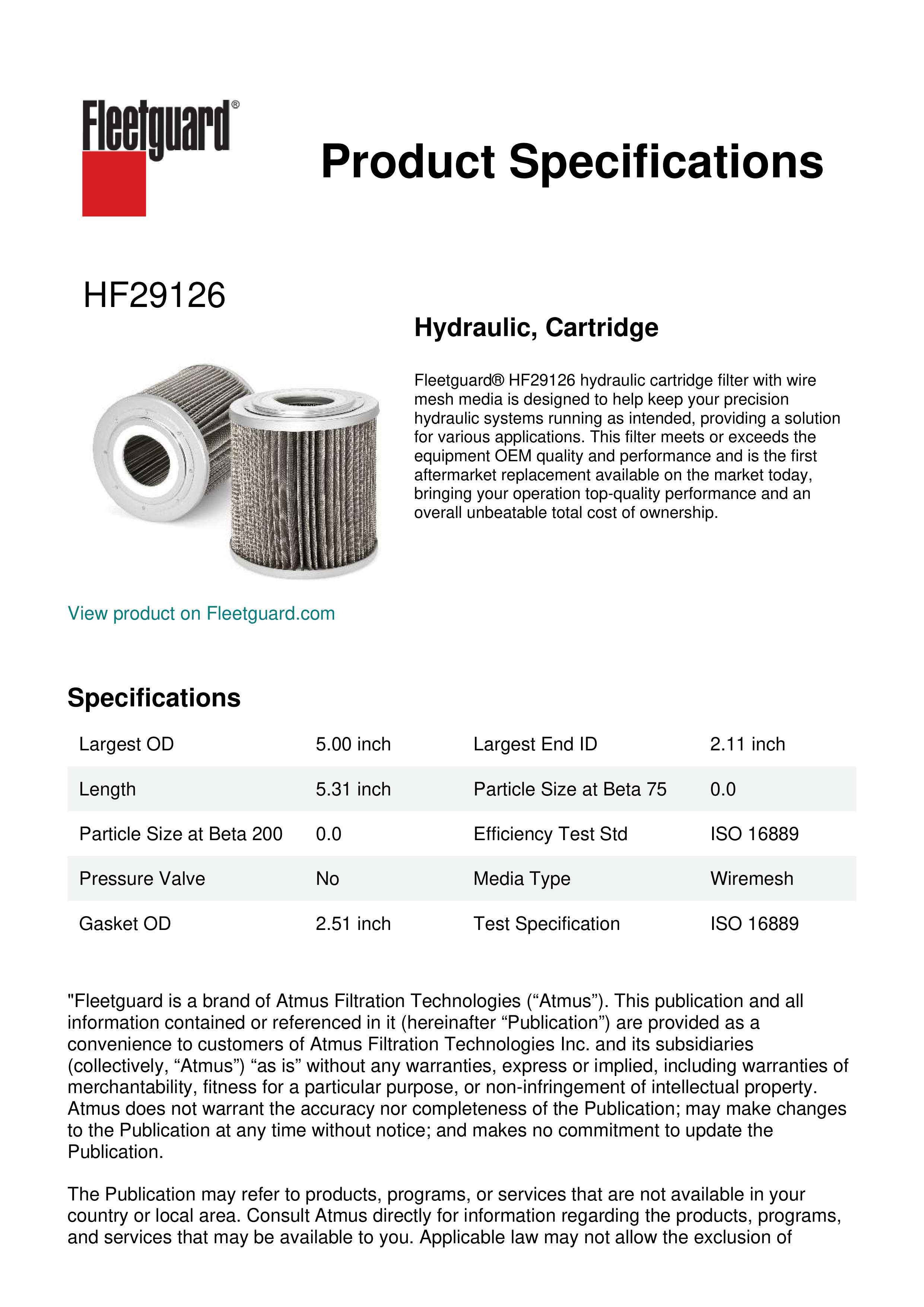 Fleetguard® HF29126 hydraulic cartridge filter with wire mesh media is designed to help keep your precision hydraulic systems running as intended, providing a solution for various applications. This filter meets or exceeds the equipment OEM quality and performance and is the first aftermarket replacement available on the market today, bringing your operation top-quality performance and an overall unbeatable total cost of ownership.Specification