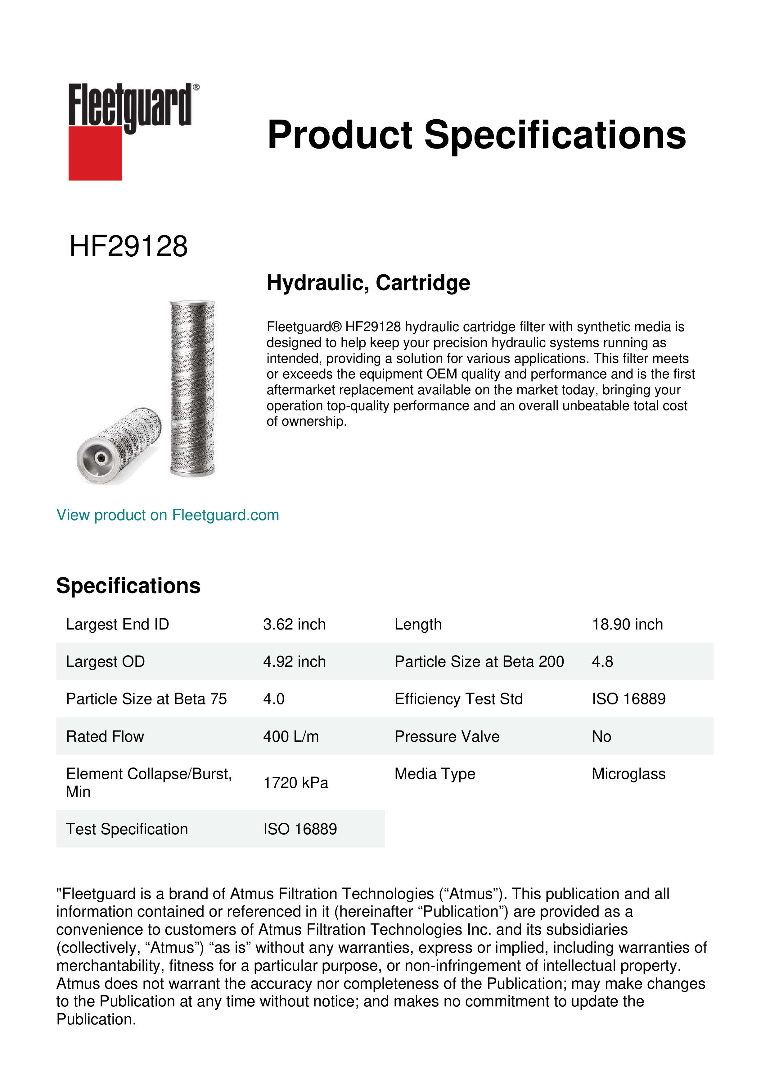 Fleetguard® HF29128 hydraulic cartridge filter with synthetic media is designed to help keep your precision hydraulic systems running as intended, providing a solution for various applications. This filter meets or exceeds the equipment OEM quality and performance and is the first aftermarket replacement available on the market today, bringing your operation top-quality performance and an overall unbeatable total cost of ownership.Specification