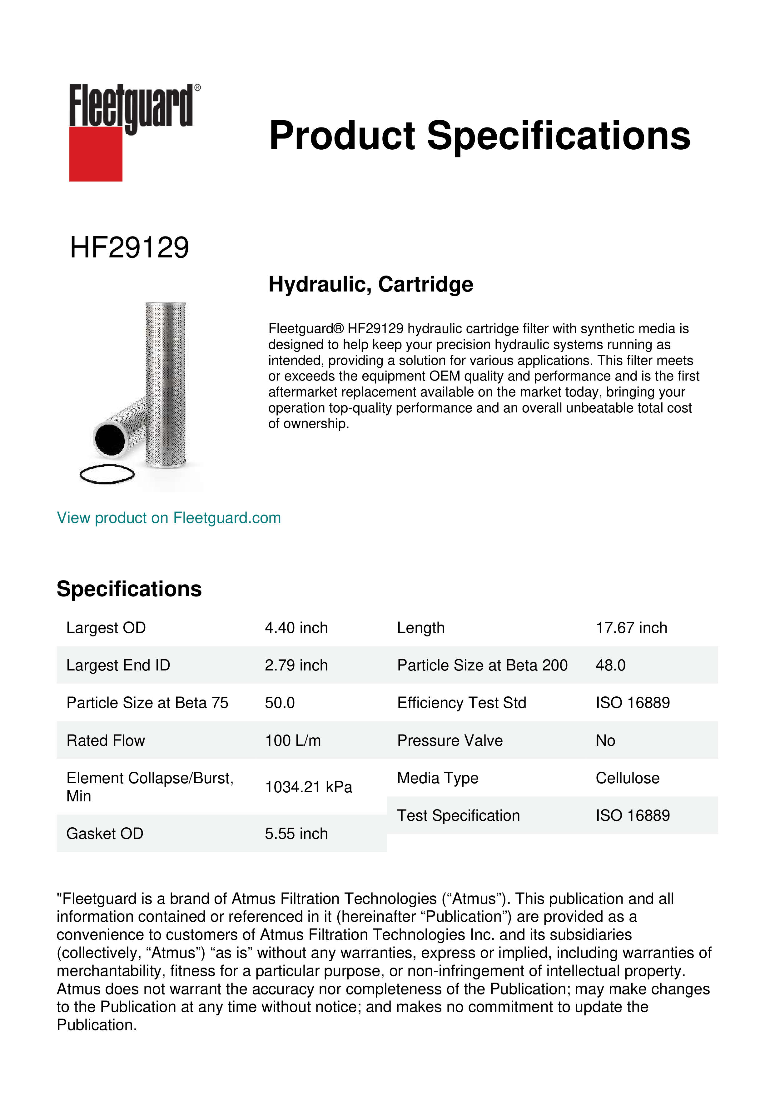 Fleetguard® HF29129 hydraulic cartridge filter with synthetic media is designed to help keep your precision hydraulic systems running as intended, providing a solution for various applications. This filter meets or exceeds the equipment OEM quality and performance and is the first aftermarket replacement available on the market today, bringing your operation top-quality performance and an overall unbeatable total cost of ownership.Specification