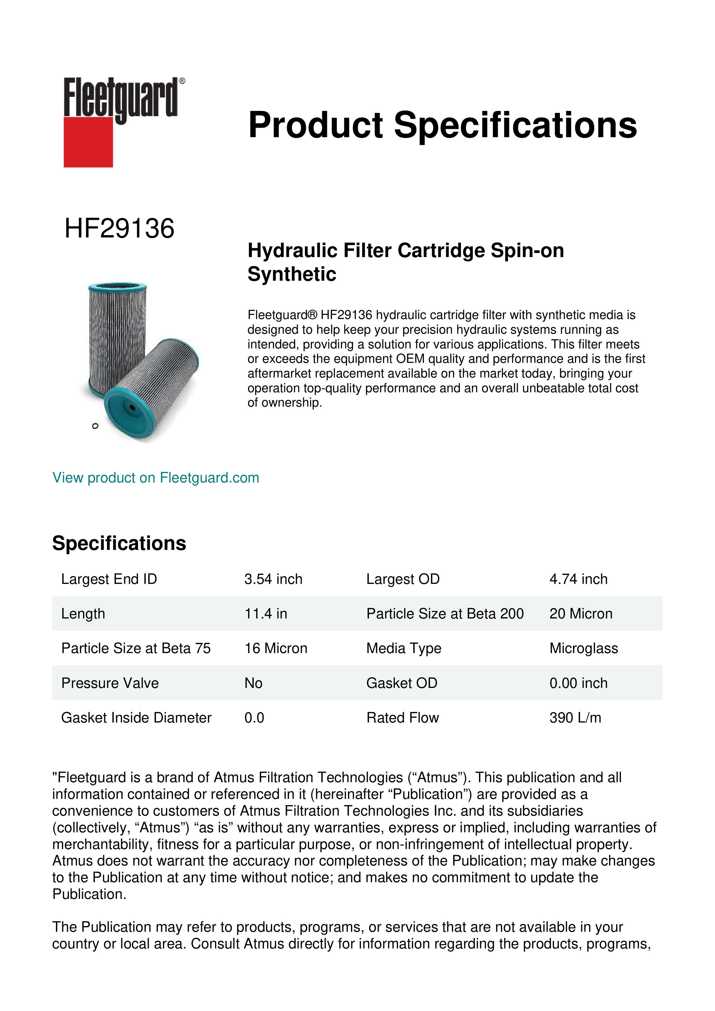 Fleetguard® HF29136 hydraulic cartridge filter with synthetic media is designed to help keep your precision hydraulic systems running as intended, providing a solution for various applications. This filter meets or exceeds the equipment OEM quality and performance and is the first aftermarket replacement available on the market today, bringing your operation top-quality performance and an overall unbeatable total cost of ownership.Specification