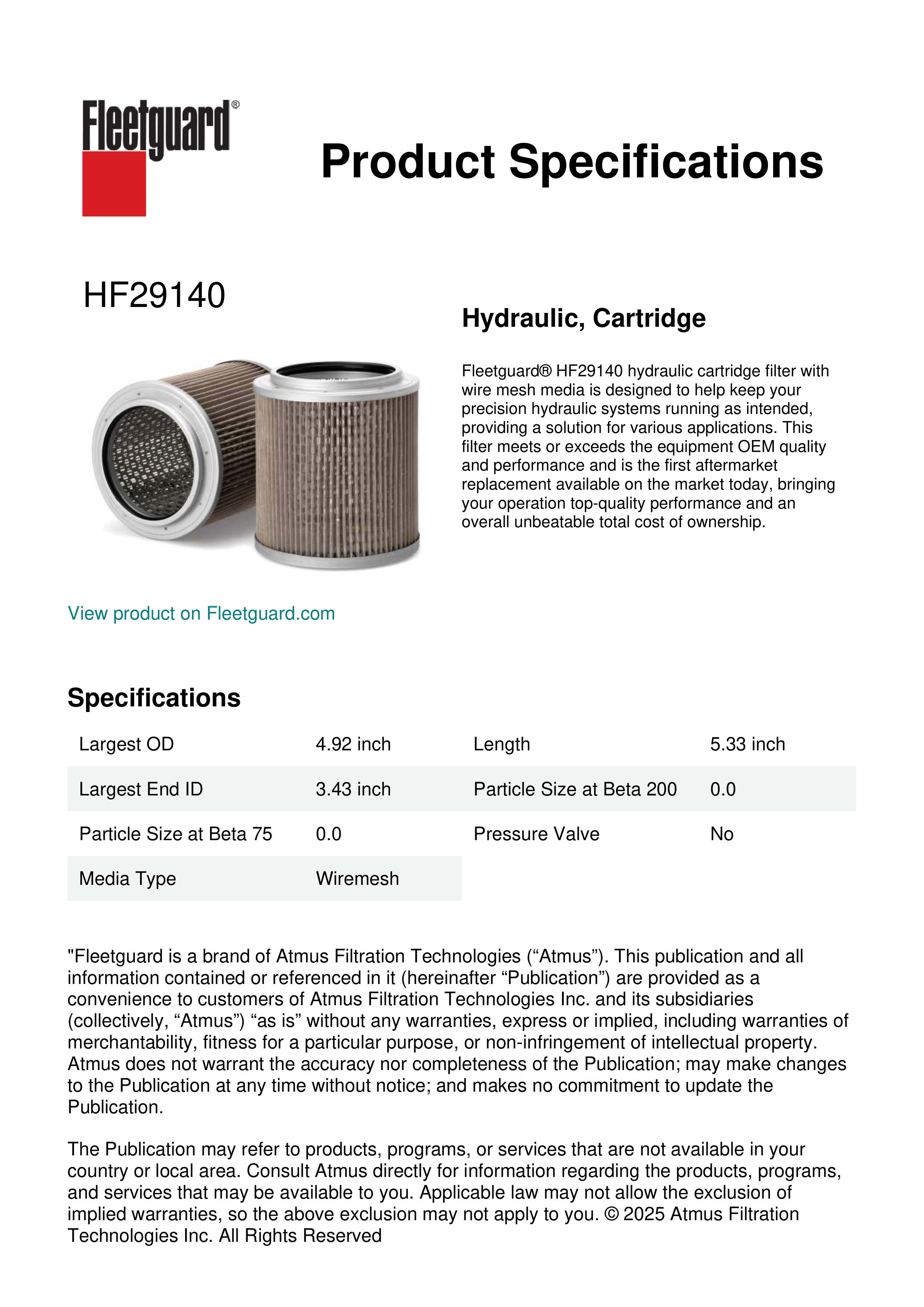 Fleetguard® HF29140 hydraulic cartridge filter with wire mesh media is designed to help keep your precision hydraulic systems running as intended, providing a solution for various applications. This filter meets or exceeds the equipment OEM quality and performance and is the first aftermarket replacement available on the market today, bringing your operation top-quality performance and an overall unbeatable total cost of ownership.Specification