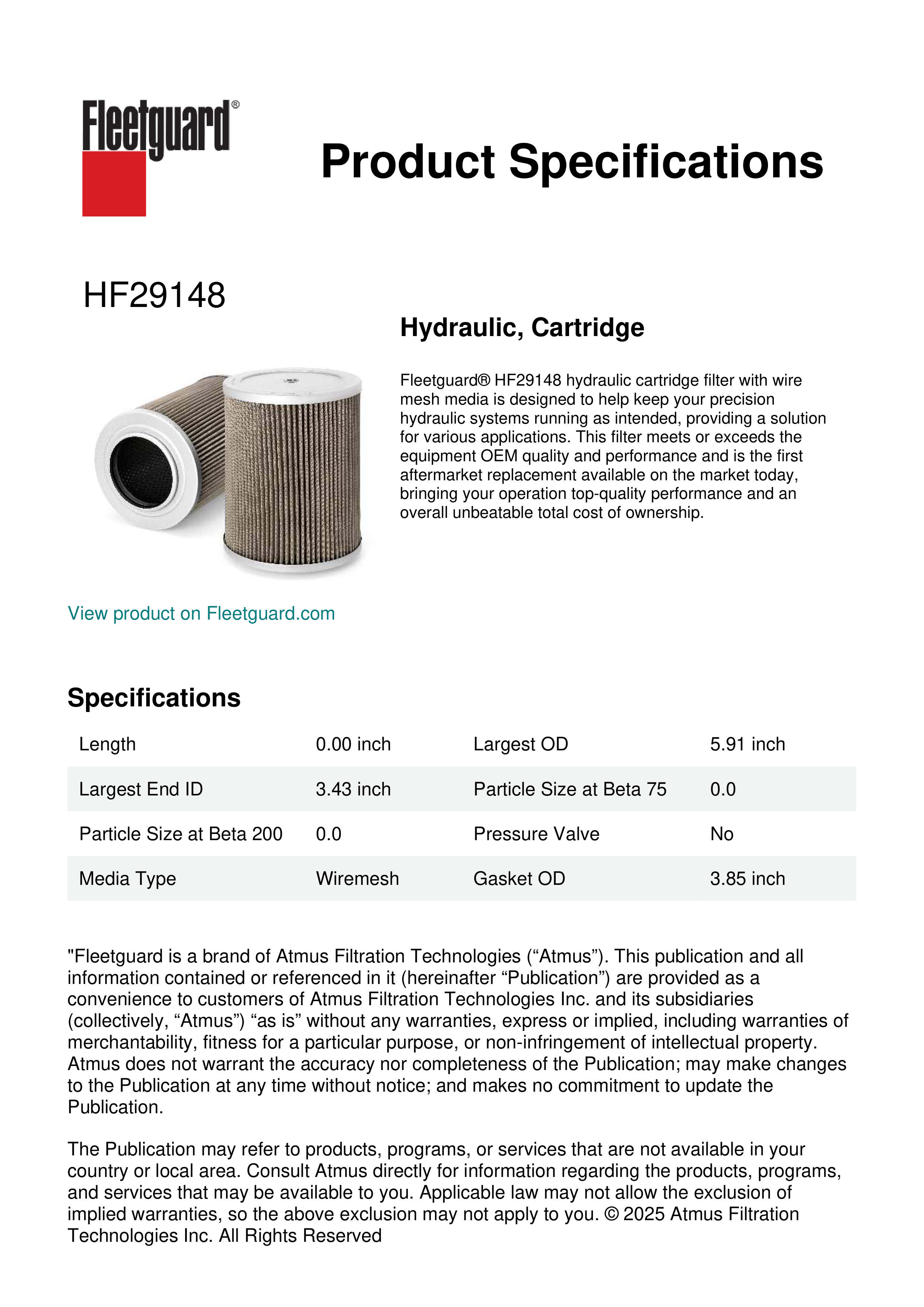 Fleetguard® HF29148 hydraulic cartridge filter with wire mesh media is designed to help keep your precision hydraulic systems running as intended, providing a solution for various applications. This filter meets or exceeds the equipment OEM quality and performance and is the first aftermarket replacement available on the market today, bringing your operation top-quality performance and an overall unbeatable total cost of ownership.Specification