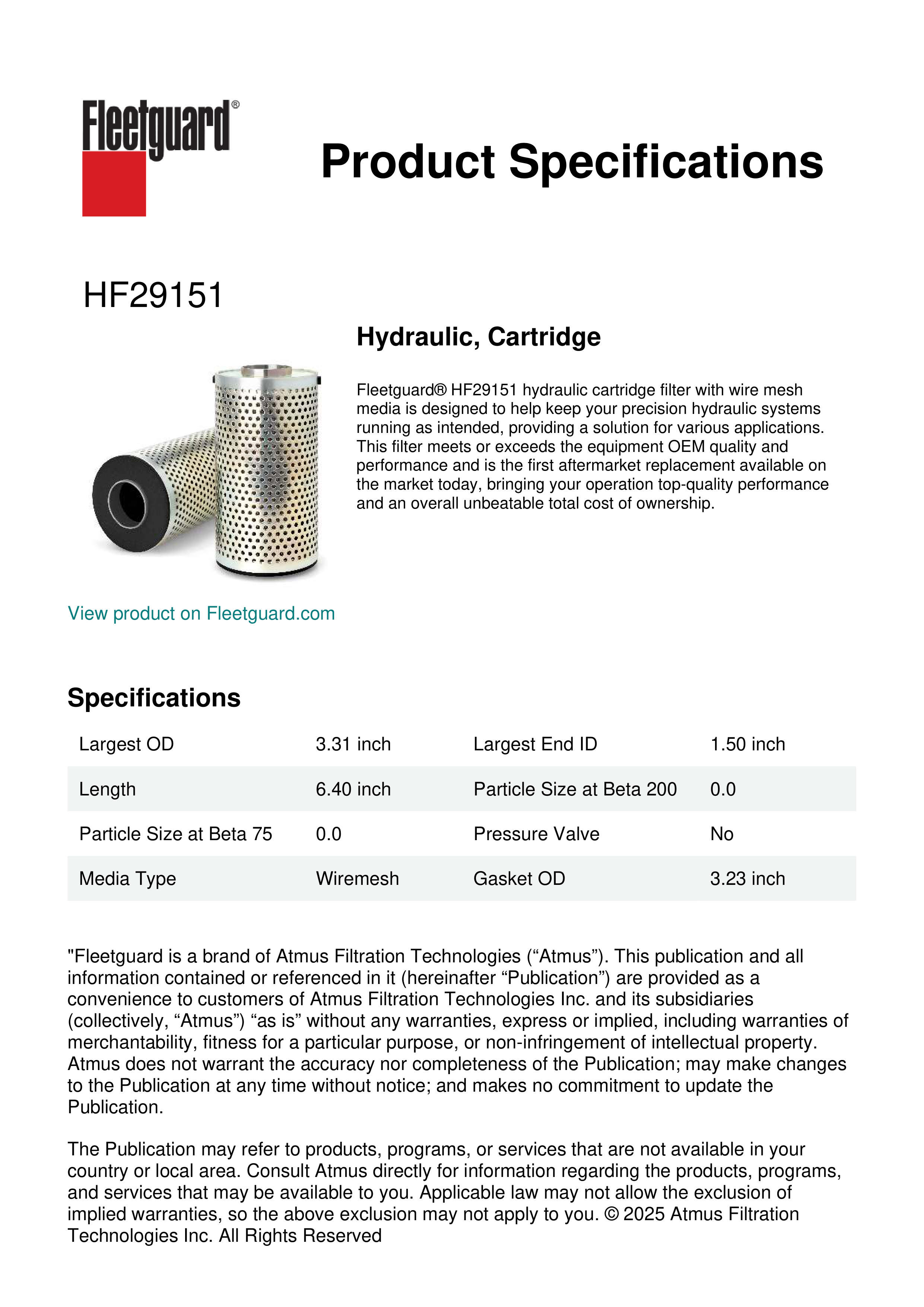 Fleetguard® HF29151 hydraulic cartridge filter with wire mesh media is designed to help keep your precision hydraulic systems running as intended, providing a solution for various applications. This filter meets or exceeds the equipment OEM quality and performance and is the first aftermarket replacement available on the market today, bringing your operation top-quality performance and an overall unbeatable total cost of ownership.Specification