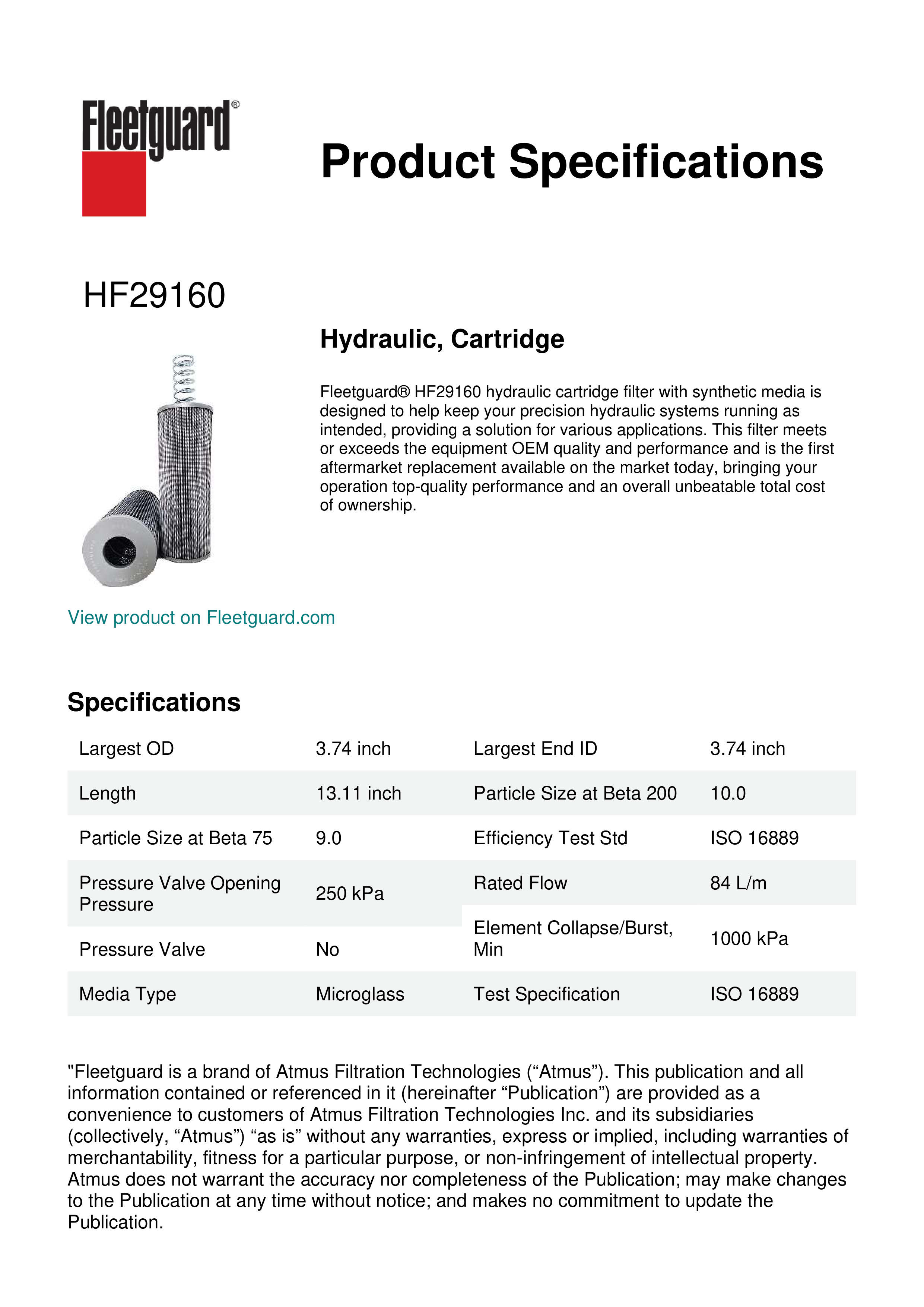 Fleetguard® HF29160 hydraulic cartridge filter with synthetic media is designed to help keep your precision hydraulic systems running as intended, providing a solution for various applications. This filter meets or exceeds the equipment OEM quality and performance and is the first aftermarket replacement available on the market today, bringing your operation top-quality performance and an overall unbeatable total cost of ownership.Specification