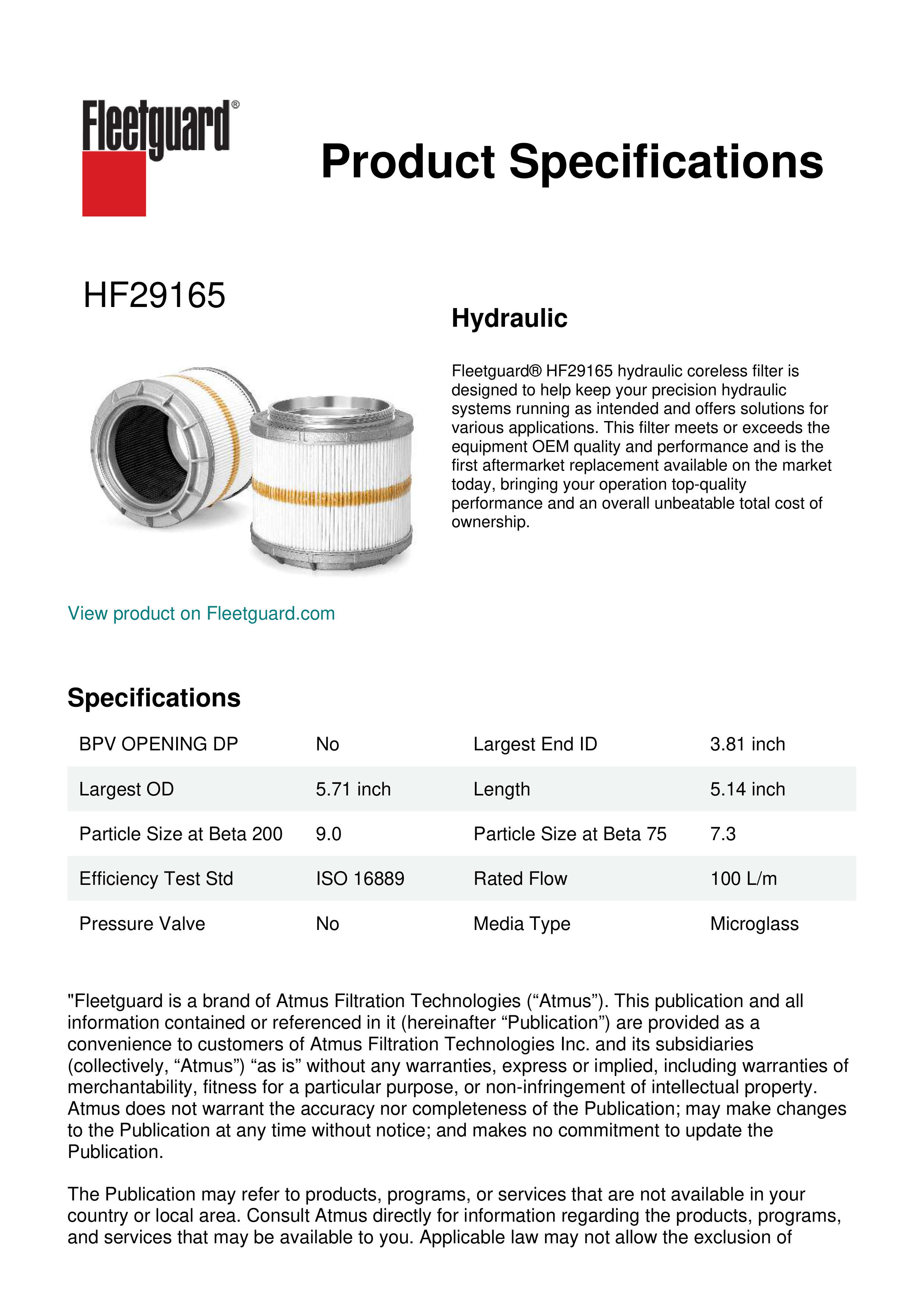 Fleetguard® HF29165 hydraulic coreless filter is designed to help keep your precision hydraulic systems running as intended and offers solutions for various applications. This filter meets or exceeds the equipment OEM quality and performance and is the first aftermarket replacement available on the market today, bringing your operation top-quality performance and an overall unbeatable total cost of ownership.Specification