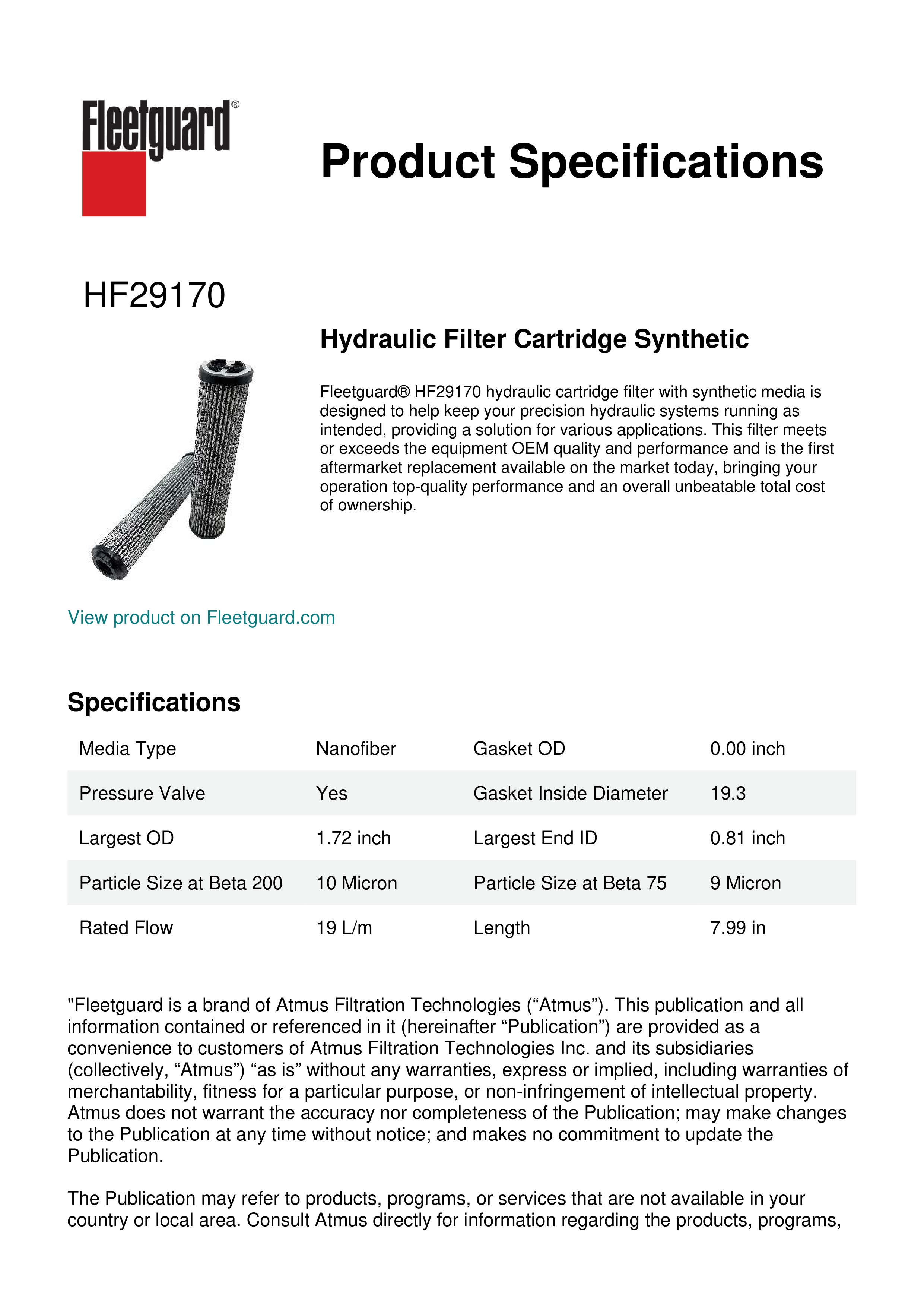 Fleetguard® HF29170 hydraulic cartridge filter with synthetic media is designed to help keep your precision hydraulic systems running as intended, providing a solution for various applications. This filter meets or exceeds the equipment OEM quality and performance and is the first aftermarket replacement available on the market today, bringing your operation top-quality performance and an overall unbeatable total cost of ownership.Specification