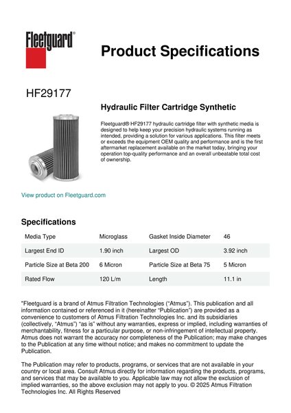Fleetguard® HF29177 hydraulic cartridge filter with synthetic media is designed to help keep your precision hydraulic systems running as intended, providing a solution for various applications. This filter meets or exceeds the equipment OEM quality and performance and is the first aftermarket replacement available on the market today, bringing your operation top-quality performance and an overall unbeatable total cost of ownership.Specification