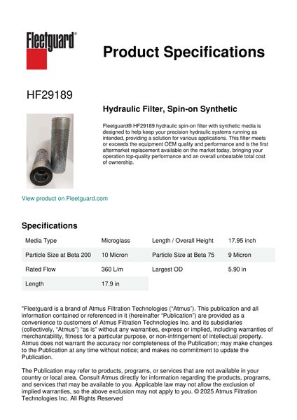Fleetguard® HF29189 hydraulic spin-on filter with synthetic media is designed to help keep your precision hydraulic systems running as intended, providing a solution for various applications. This filter meets or exceeds the equipment OEM quality and performance and is the first aftermarket replacement available on the market today, bringing your operation top-quality performance and an overall unbeatable total cost of ownership.Specification