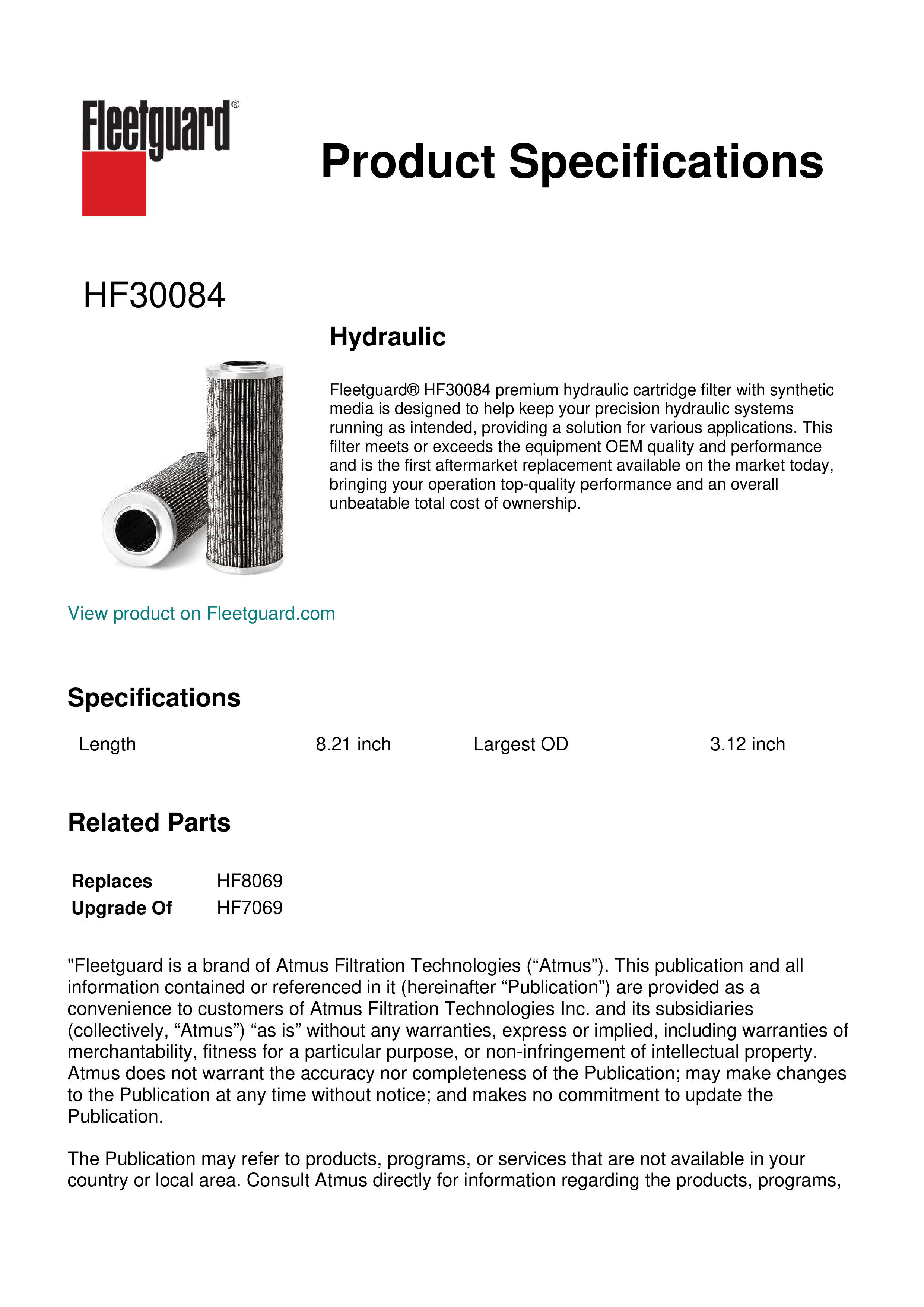 Fleetguard® HF30084 premium hydraulic cartridge filter with synthetic media is designed to help keep your precision hydraulic systems running as intended, providing a solution for various applications. This filter meets or exceeds the equipment OEM quality and performance and is the first aftermarket replacement available on the market today, bringing your operation top-quality performance and an overall unbeatable total cost of ownership.Specification