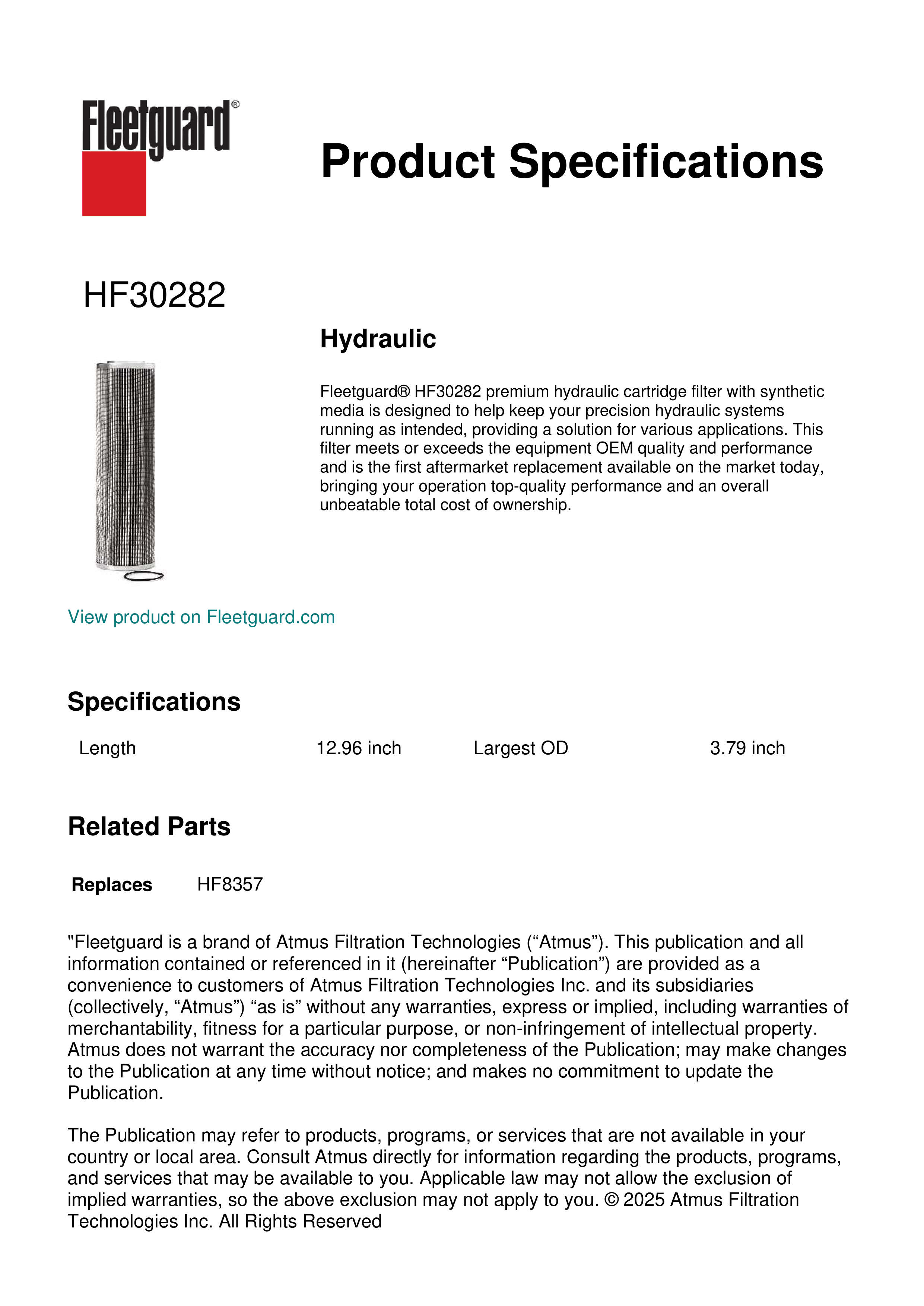 Fleetguard® HF30282 premium hydraulic cartridge filter with synthetic media is designed to help keep your precision hydraulic systems running as intended, providing a solution for various applications. This filter meets or exceeds the equipment OEM quality and performance and is the first aftermarket replacement available on the market today, bringing your operation top-quality performance and an overall unbeatable total cost of ownership.Specification