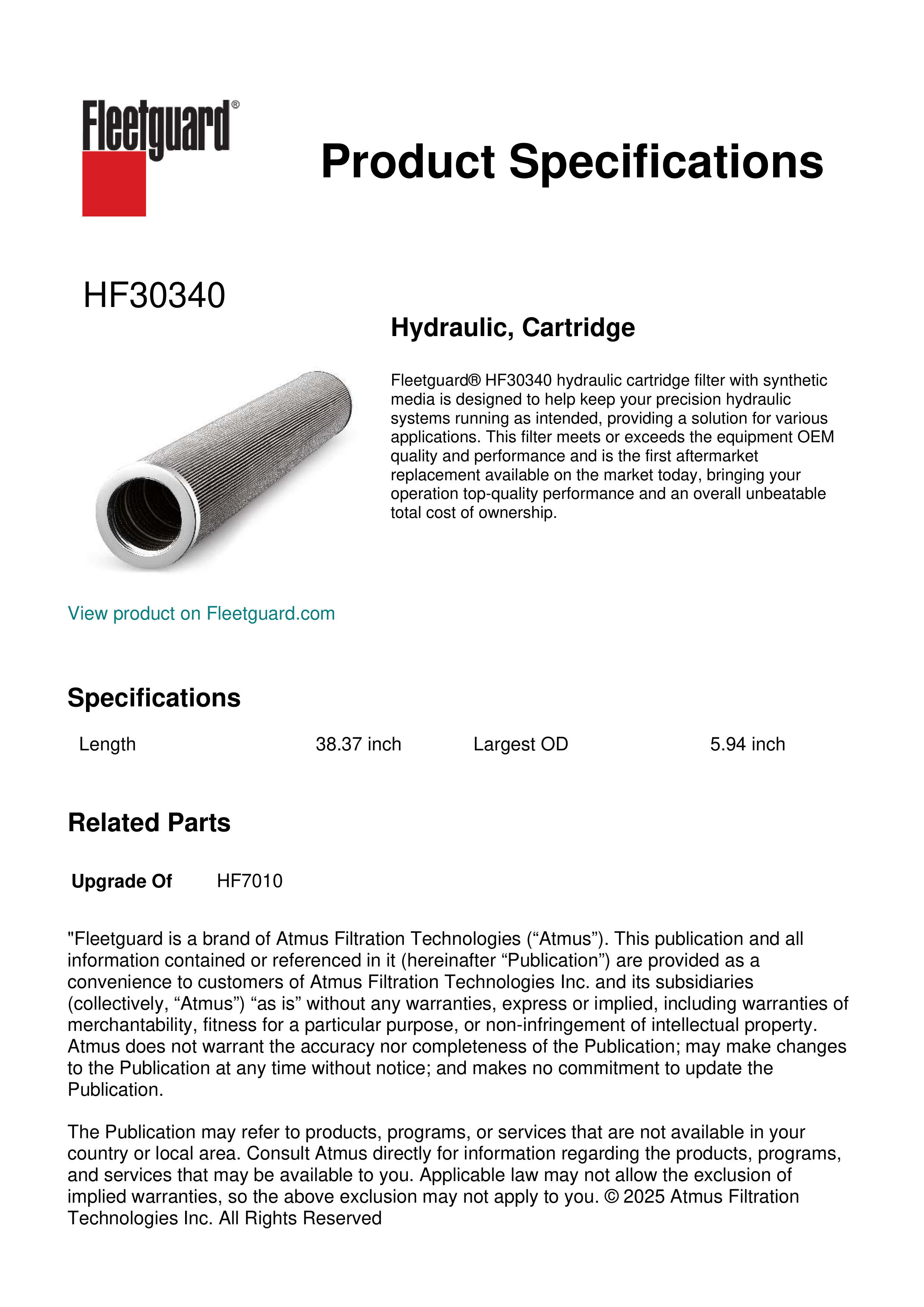 Fleetguard® HF30340 hydraulic cartridge filter with synthetic media is designed to help keep your precision hydraulic systems running as intended, providing a solution for various applications. This filter meets or exceeds the equipment OEM quality and performance and is the first aftermarket replacement available on the market today, bringing your operation top-quality performance and an overall unbeatable total cost of ownership.Specification