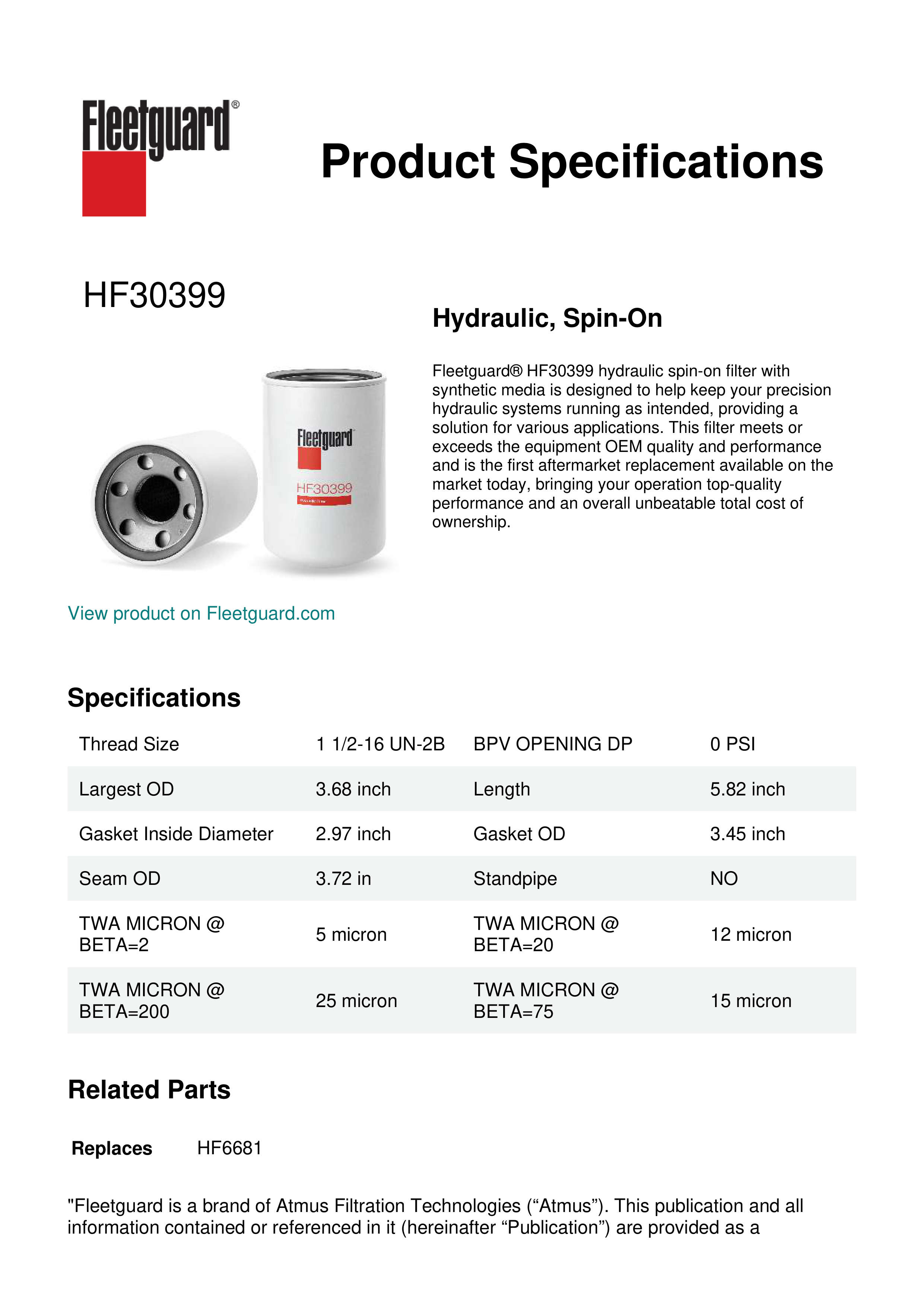 Fleetguard® HF30399 hydraulic spin-on filter with synthetic media is designed to help keep your precision hydraulic systems running as intended, providing a solution for various applications. This filter meets or exceeds the equipment OEM quality and performance and is the first aftermarket replacement available on the market today, bringing your operation top-quality performance and an overall unbeatable total cost of ownership.Specification