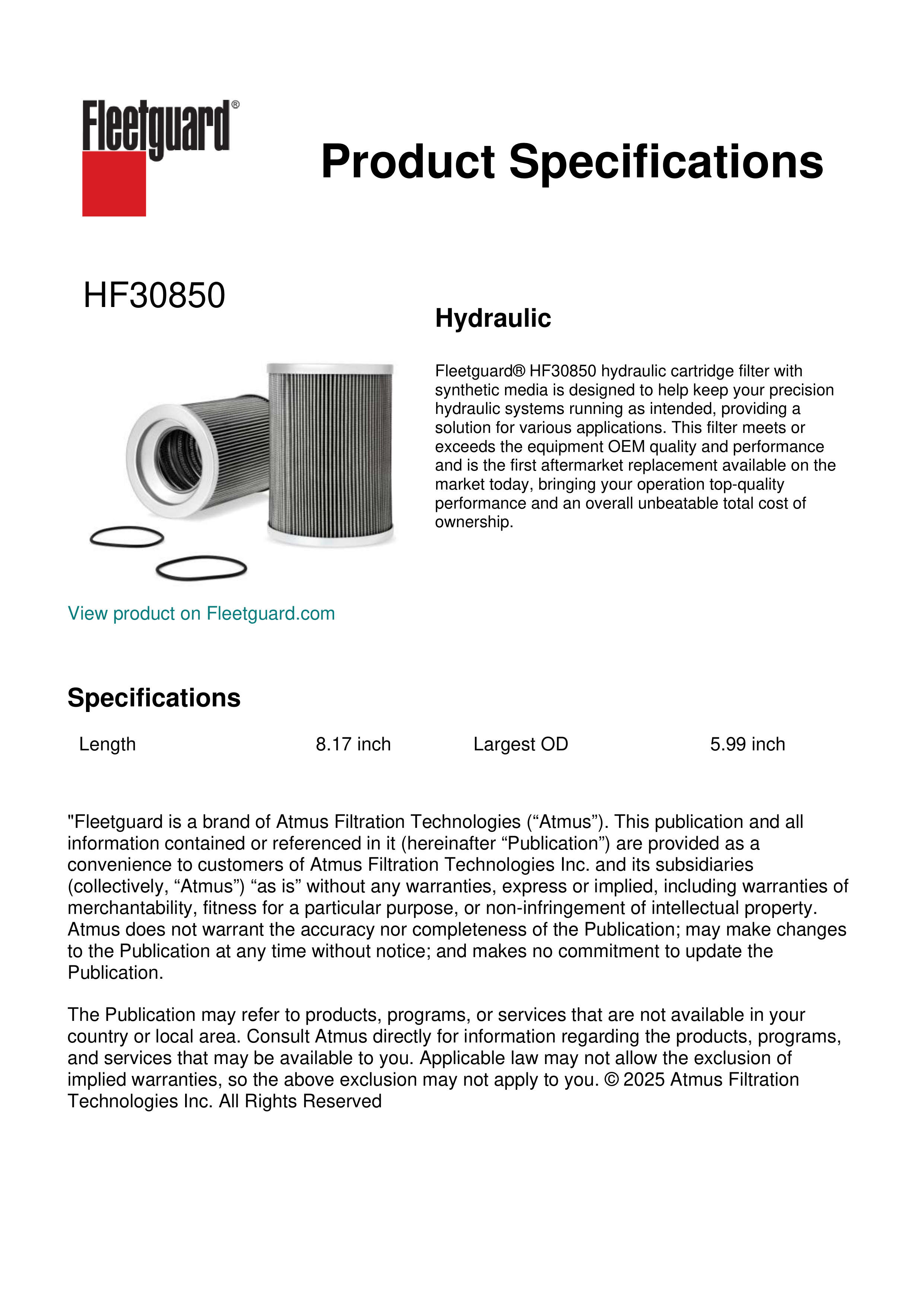 Fleetguard® HF30850 hydraulic cartridge filter with synthetic media is designed to help keep your precision hydraulic systems running as intended, providing a solution for various applications. This filter meets or exceeds the equipment OEM quality and performance and is the first aftermarket replacement available on the market today, bringing your operation top-quality performance and an overall unbeatable total cost of ownership.Specification