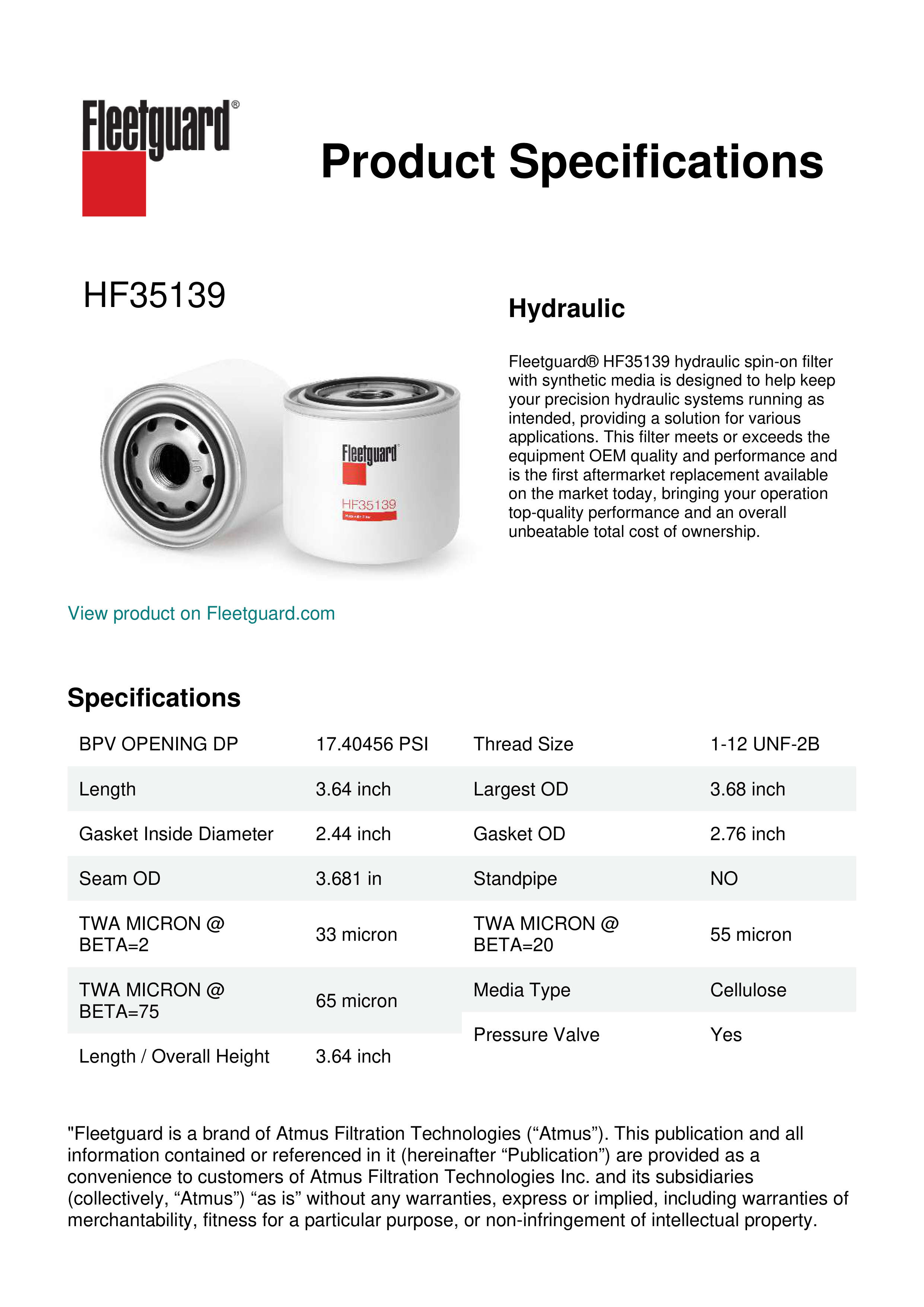 Fleetguard® HF35139 hydraulic spin-on filter with synthetic media is designed to help keep your precision hydraulic systems running as intended, providing a solution for various applications. This filter meets or exceeds the equipment OEM quality and performance and is the first aftermarket replacement available on the market today, bringing your operation top-quality performance and an overall unbeatable total cost of ownership.Specification