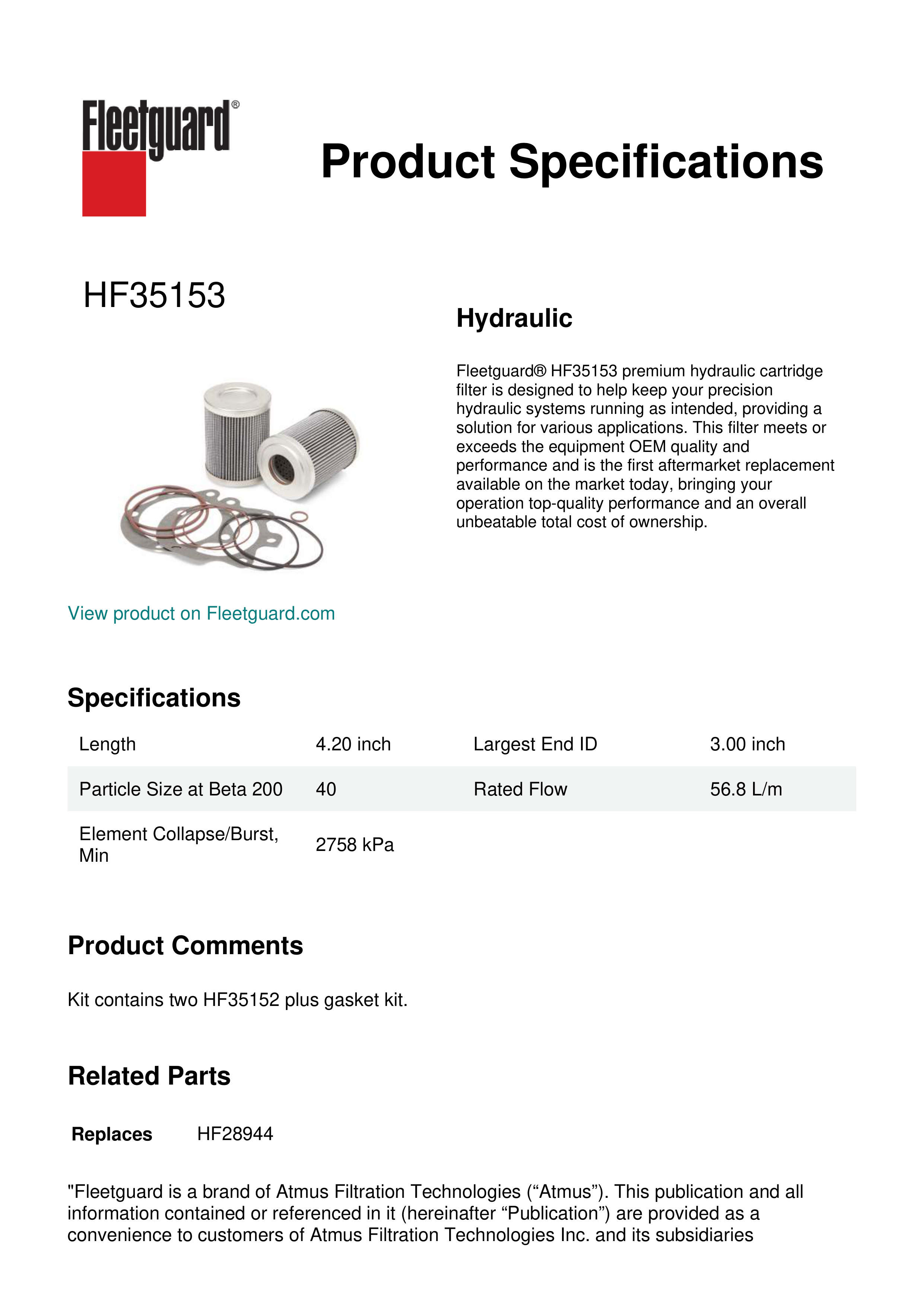 Fleetguard® HF35153 premium hydraulic cartridge filter is designed to help keep your precision hydraulic systems running as intended, providing a solution for various applications. This filter meets or exceeds the equipment OEM quality and performance and is the first aftermarket replacement available on the market today, bringing your operation top-quality performance and an overall unbeatable total cost of ownership.Specification