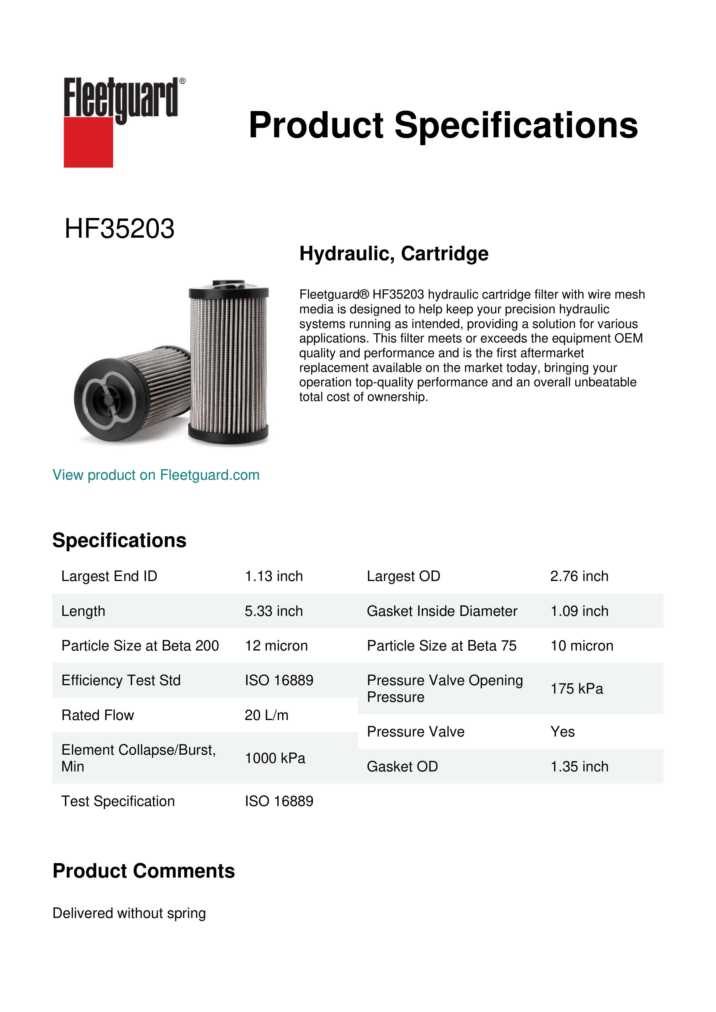 Fleetguard® HF35203 hydraulic cartridge filter with wire mesh media is designed to help keep your precision hydraulic systems running as intended, providing a solution for various applications. This filter meets or exceeds the equipment OEM quality and performance and is the first aftermarket replacement available on the market today, bringing your operation top-quality performance and an overall unbeatable total cost of ownership.Specification