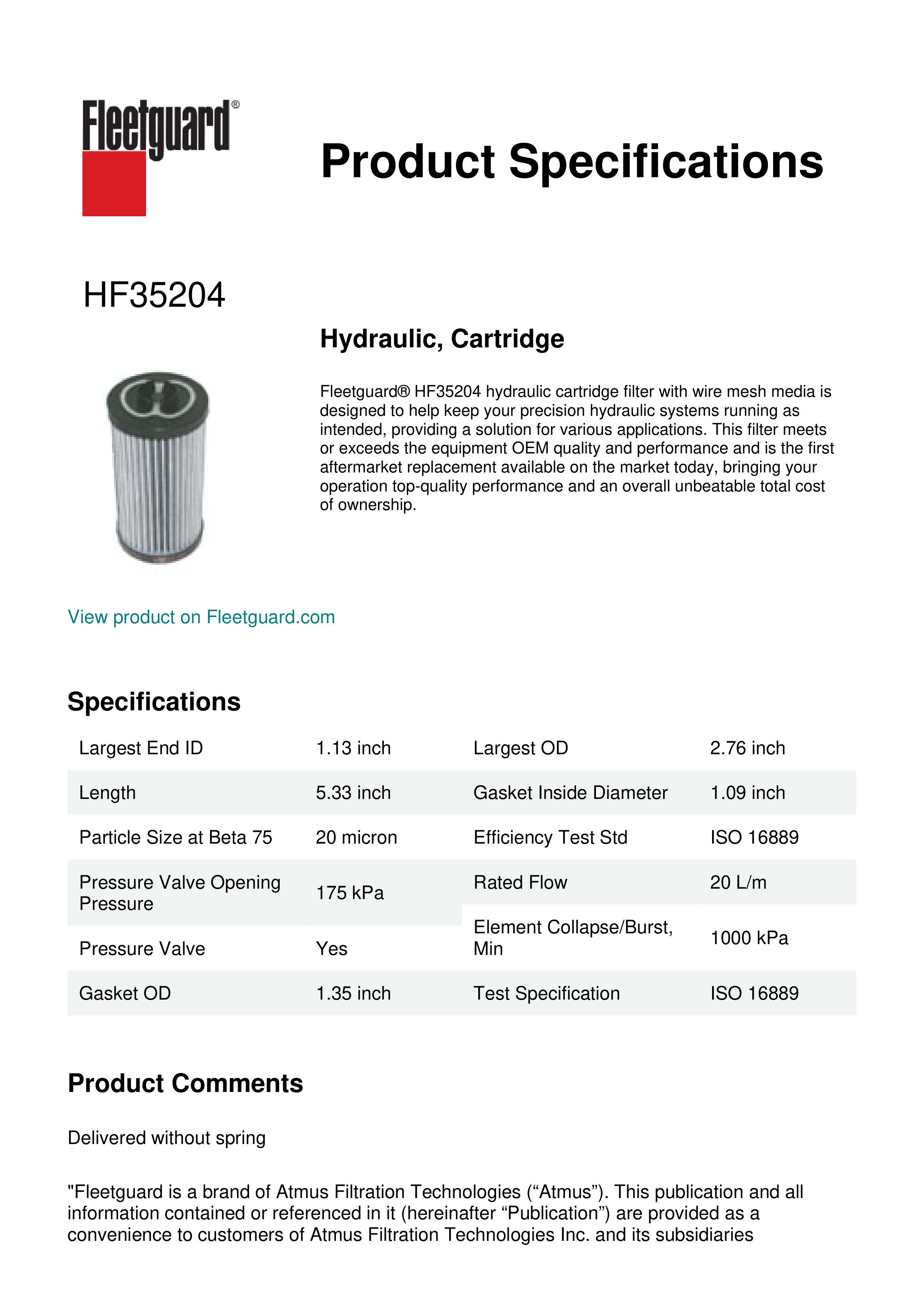 Fleetguard® HF35204 hydraulic cartridge filter with wire mesh media is designed to help keep your precision hydraulic systems running as intended, providing a solution for various applications. This filter meets or exceeds the equipment OEM quality and performance and is the first aftermarket replacement available on the market today, bringing your operation top-quality performance and an overall unbeatable total cost of ownership.Specification
