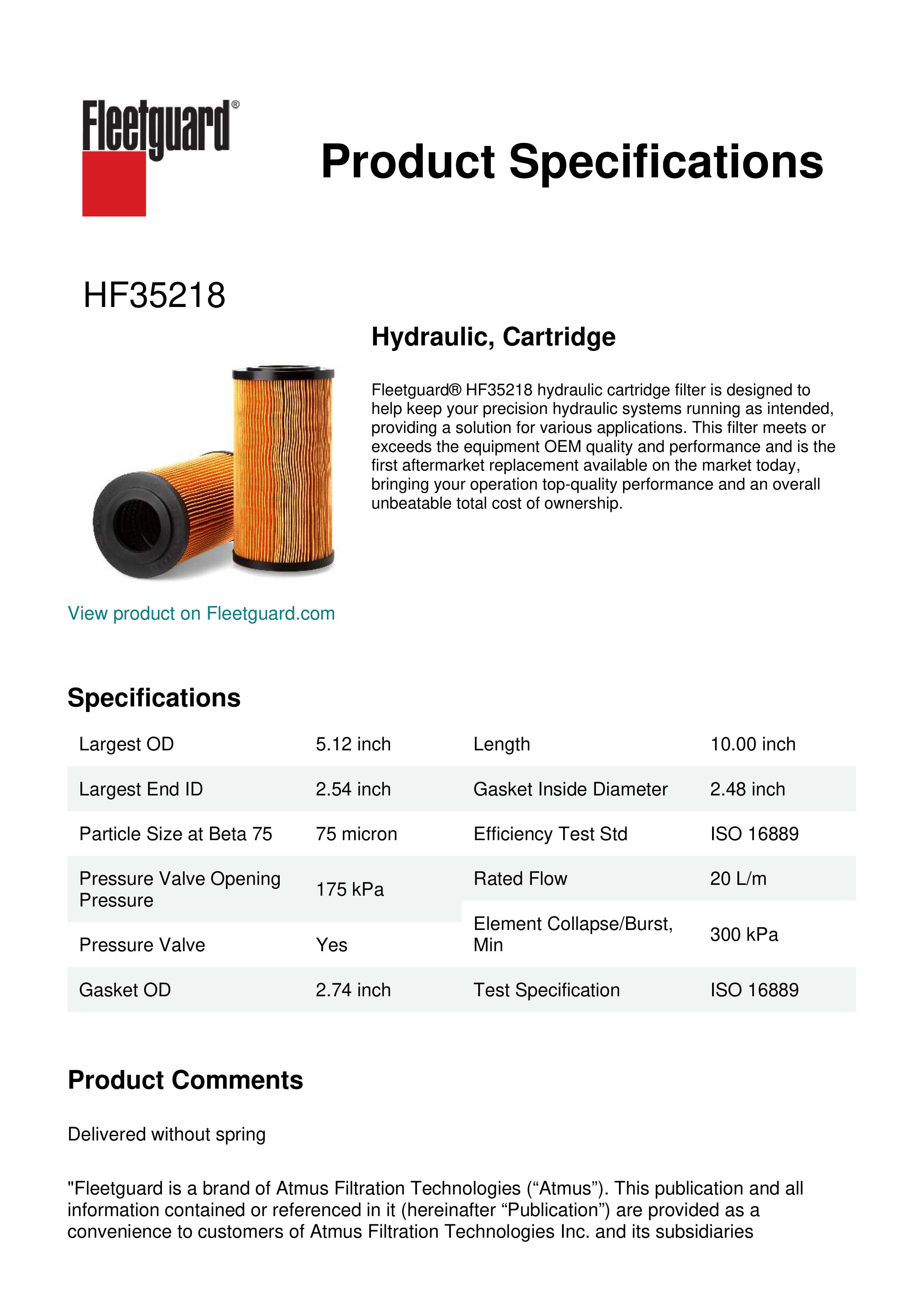 Fleetguard® HF35218 hydraulic cartridge filter is designed to help keep your precision hydraulic systems running as intended, providing a solution for various applications. This filter meets or exceeds the equipment OEM quality and performance and is the first aftermarket replacement available on the market today, bringing your operation top-quality performance and an overall unbeatable total cost of ownership.Specification