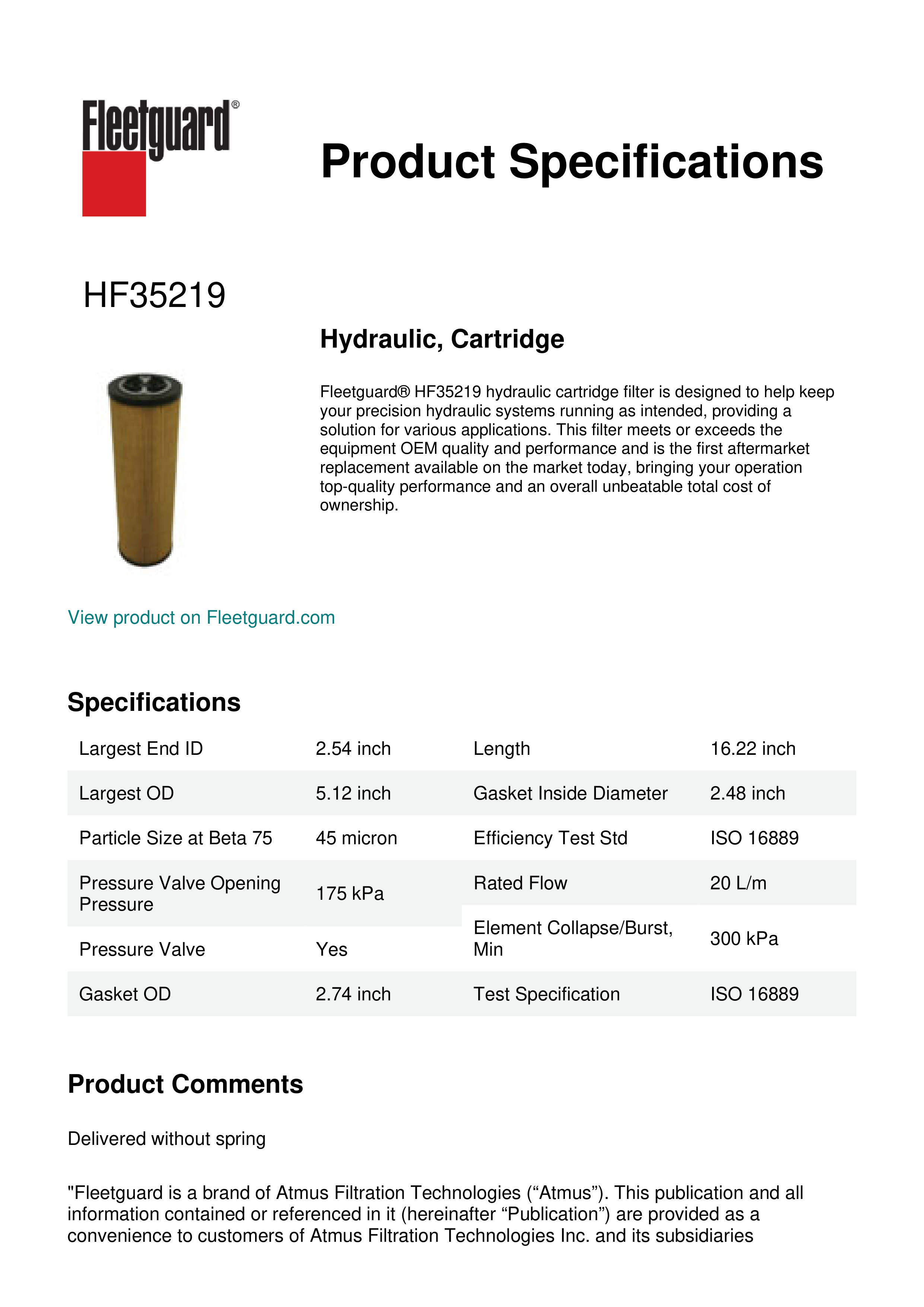 Fleetguard® HF35219 hydraulic cartridge filter is designed to help keep your precision hydraulic systems running as intended, providing a solution for various applications. This filter meets or exceeds the equipment OEM quality and performance and is the first aftermarket replacement available on the market today, bringing your operation top-quality performance and an overall unbeatable total cost of ownership.Specification