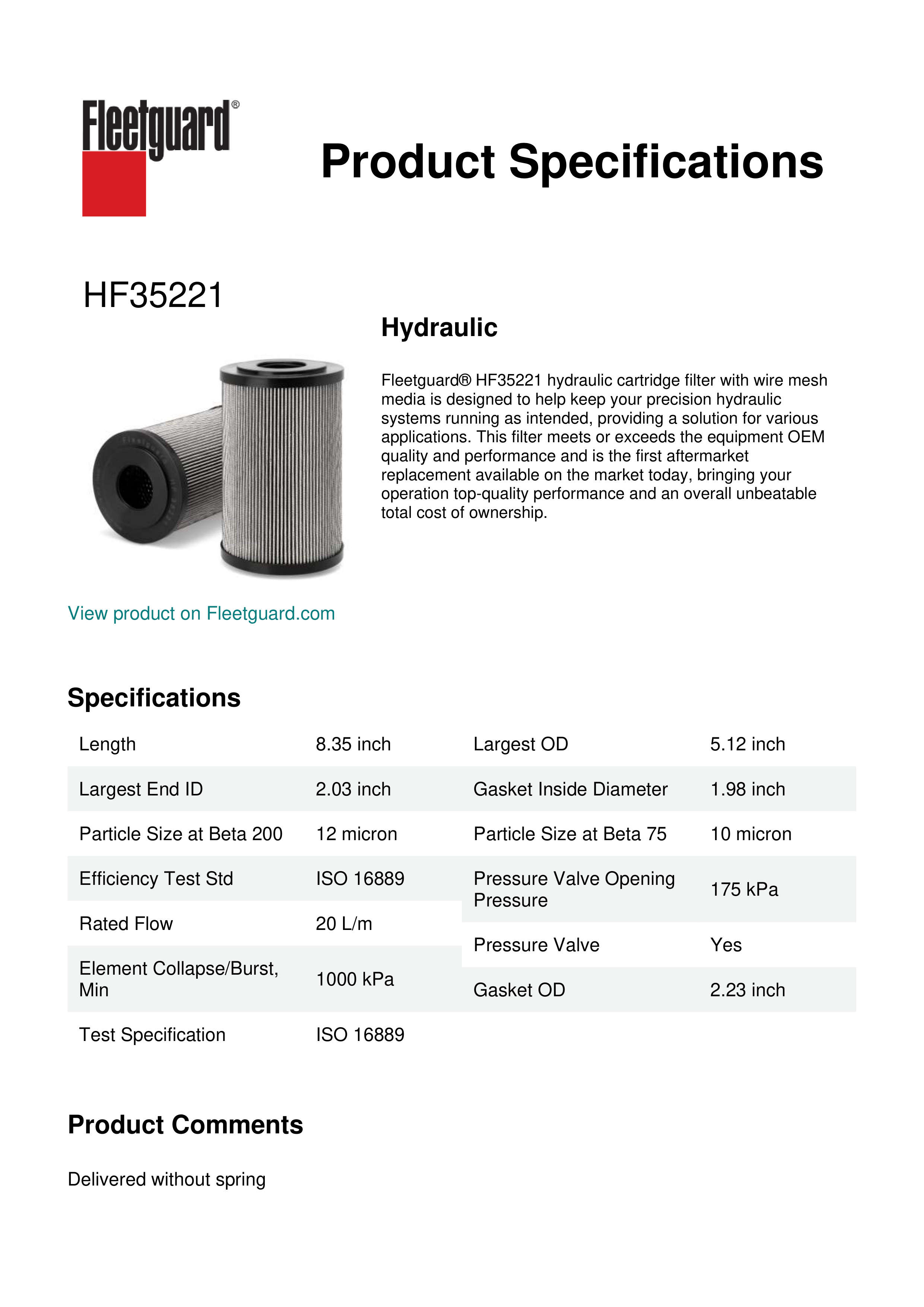 Fleetguard® HF35221 hydraulic cartridge filter with wire mesh media is designed to help keep your precision hydraulic systems running as intended, providing a solution for various applications. This filter meets or exceeds the equipment OEM quality and performance and is the first aftermarket replacement available on the market today, bringing your operation top-quality performance and an overall unbeatable total cost of ownership.Specification