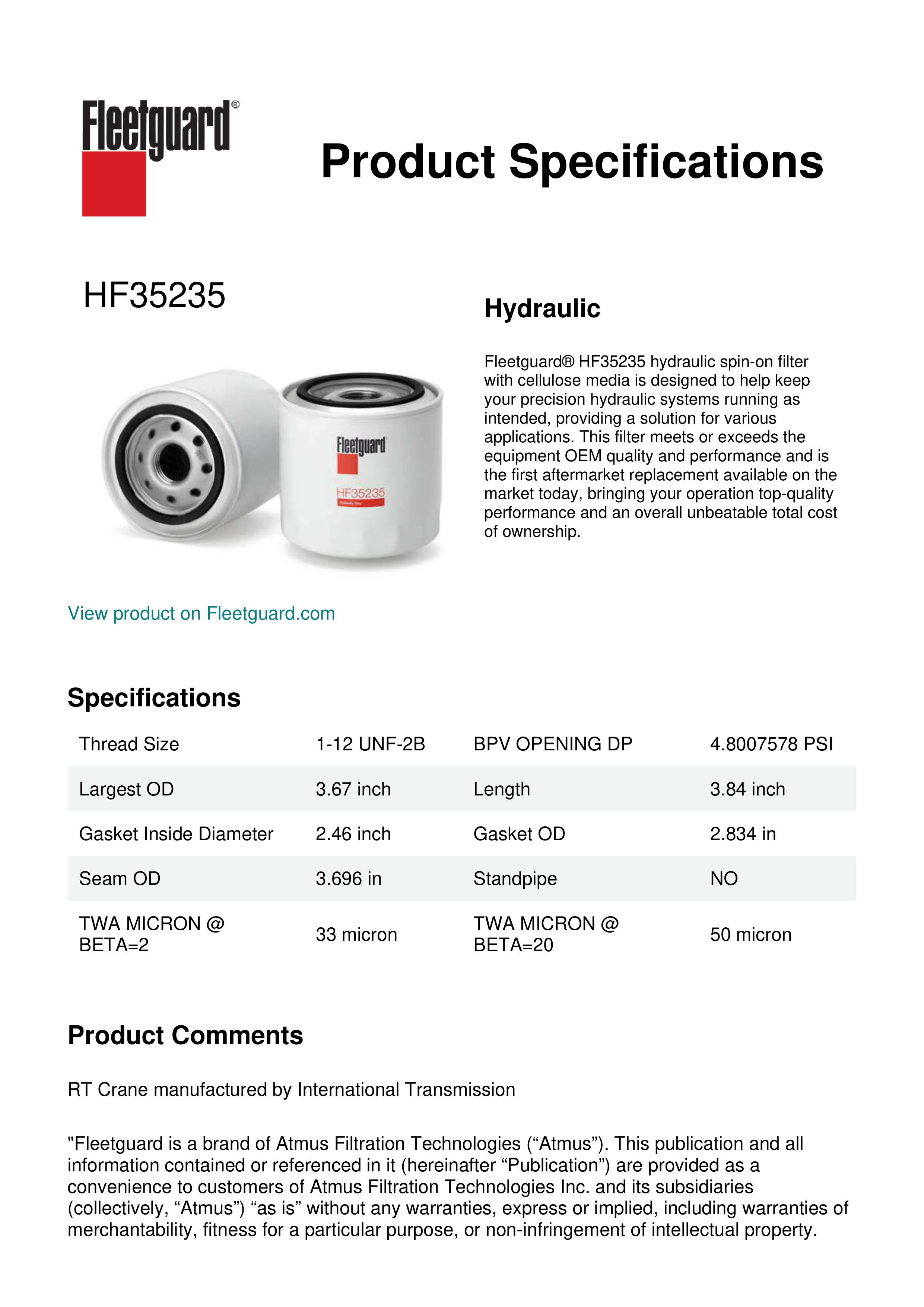 Fleetguard® HF35235 hydraulic spin-on filter with cellulose media is designed to help keep your precision hydraulic systems running as intended, providing a solution for various applications. This filter meets or exceeds the equipment OEM quality and performance and is the first aftermarket replacement available on the market today, bringing your operation top-quality performance and an overall unbeatable total cost of ownership.Specification