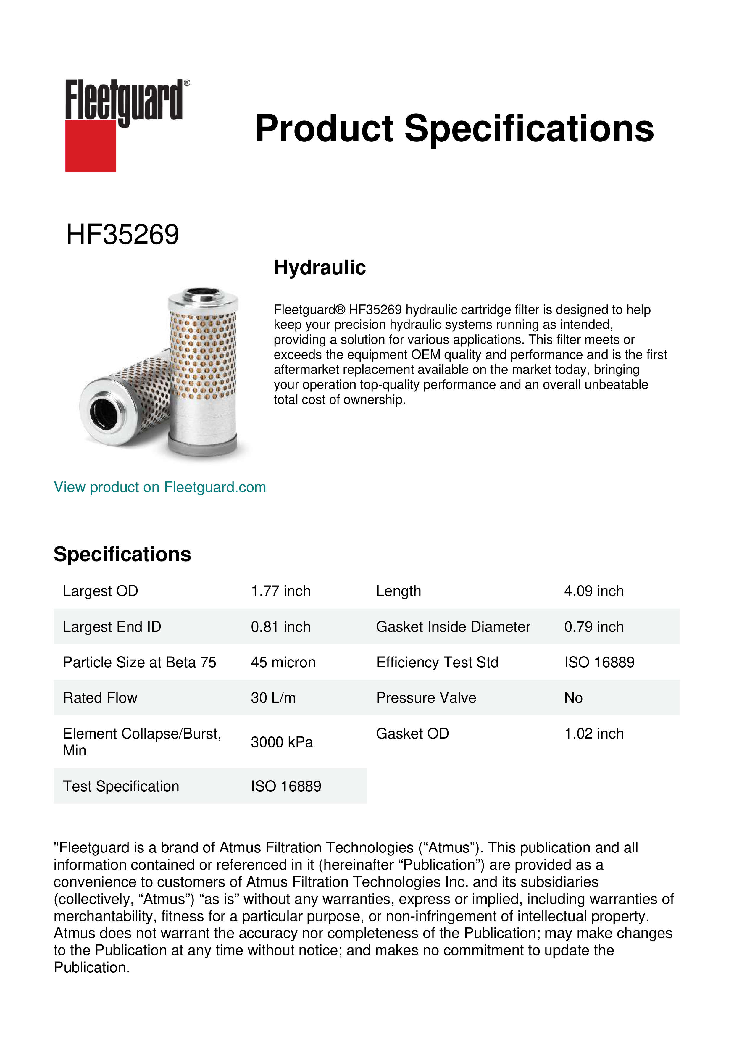 Fleetguard® HF35269 hydraulic cartridge filter is designed to help keep your precision hydraulic systems running as intended, providing a solution for various applications. This filter meets or exceeds the equipment OEM quality and performance and is the first aftermarket replacement available on the market today, bringing your operation top-quality performance and an overall unbeatable total cost of ownership.Specification