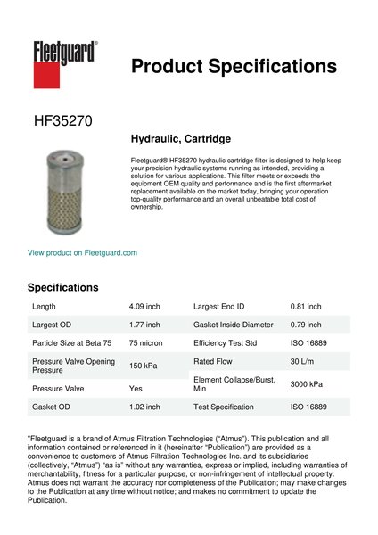 Fleetguard® HF35270 hydraulic cartridge filter is designed to help keep your precision hydraulic systems running as intended, providing a solution for various applications. This filter meets or exceeds the equipment OEM quality and performance and is the first aftermarket replacement available on the market today, bringing your operation top-quality performance and an overall unbeatable total cost of ownership.Specification