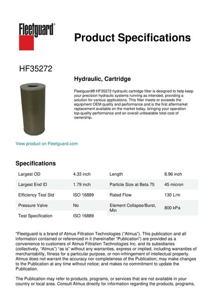 Fleetguard® HF35272 hydraulic cartridge filter is designed to help keep your precision hydraulic systems running as intended, providing a solution for various applications. This filter meets or exceeds the equipment OEM quality and performance and is the first aftermarket replacement available on the market today, bringing your operation top-quality performance and an overall unbeatable total cost of ownership.Specification