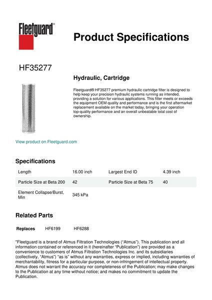 Fleetguard® HF35277 premium hydraulic cartridge filter is designed to help keep your precision hydraulic systems running as intended, providing a solution for various applications. This filter meets or exceeds the equipment OEM quality and performance and is the first aftermarket replacement available on the market today, bringing your operation top-quality performance and an overall unbeatable total cost of ownership.Specification