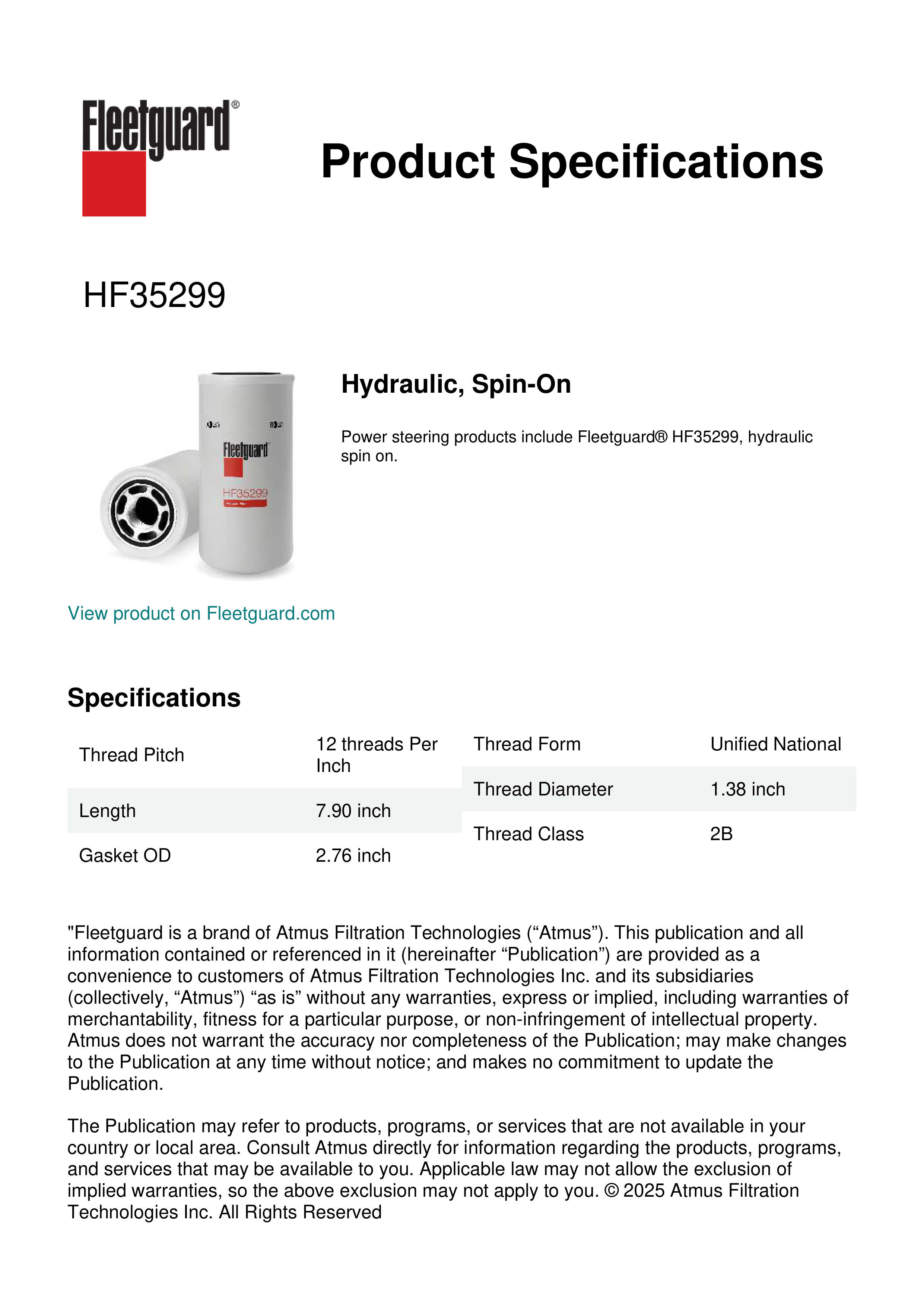 Power steering products include Fleetguard® HF35299, hydraulic spin on.Specification