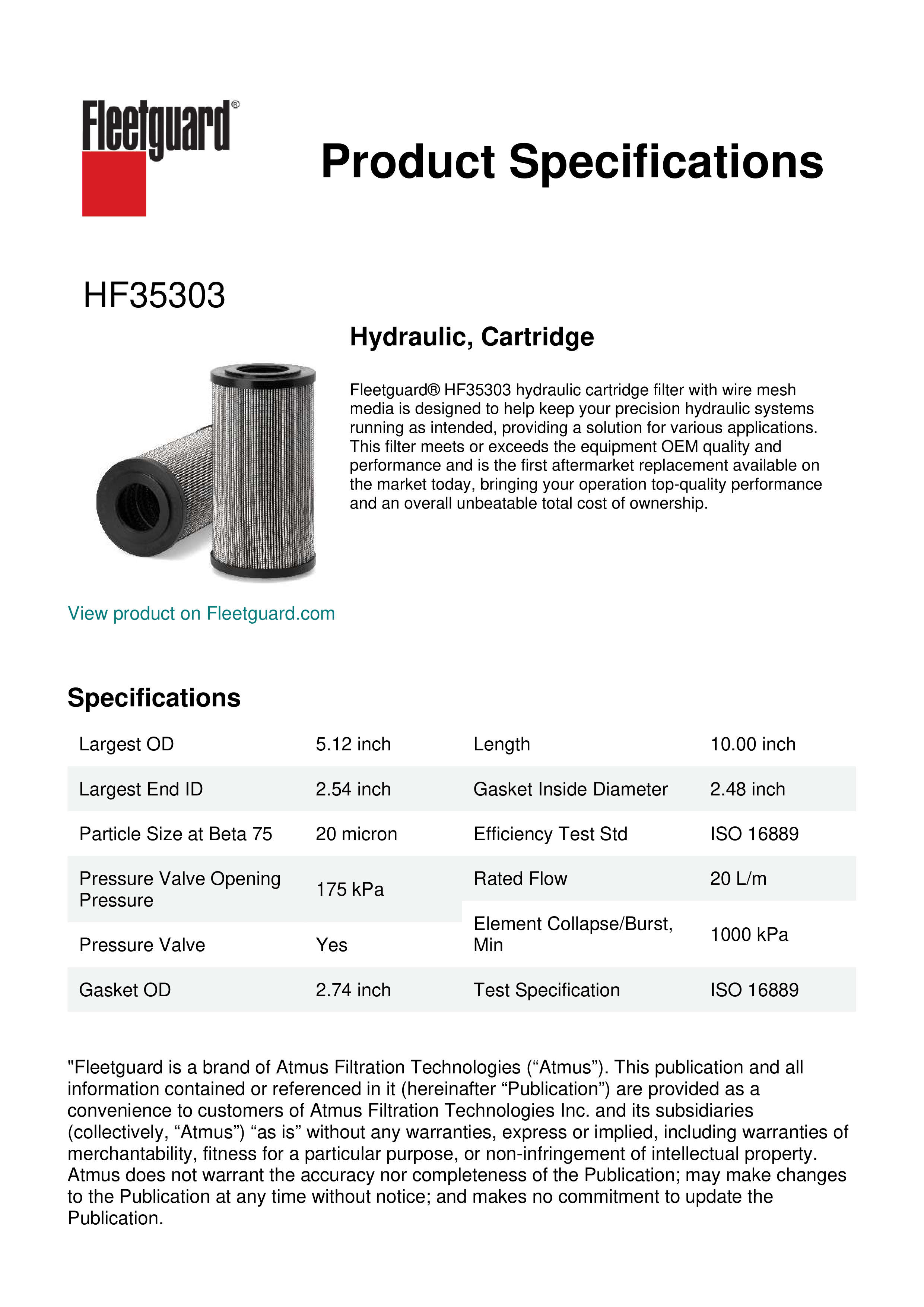 Fleetguard® HF35303 hydraulic cartridge filter with wire mesh media is designed to help keep your precision hydraulic systems running as intended, providing a solution for various applications. This filter meets or exceeds the equipment OEM quality and performance and is the first aftermarket replacement available on the market today, bringing your operation top-quality performance and an overall unbeatable total cost of ownership.Specification