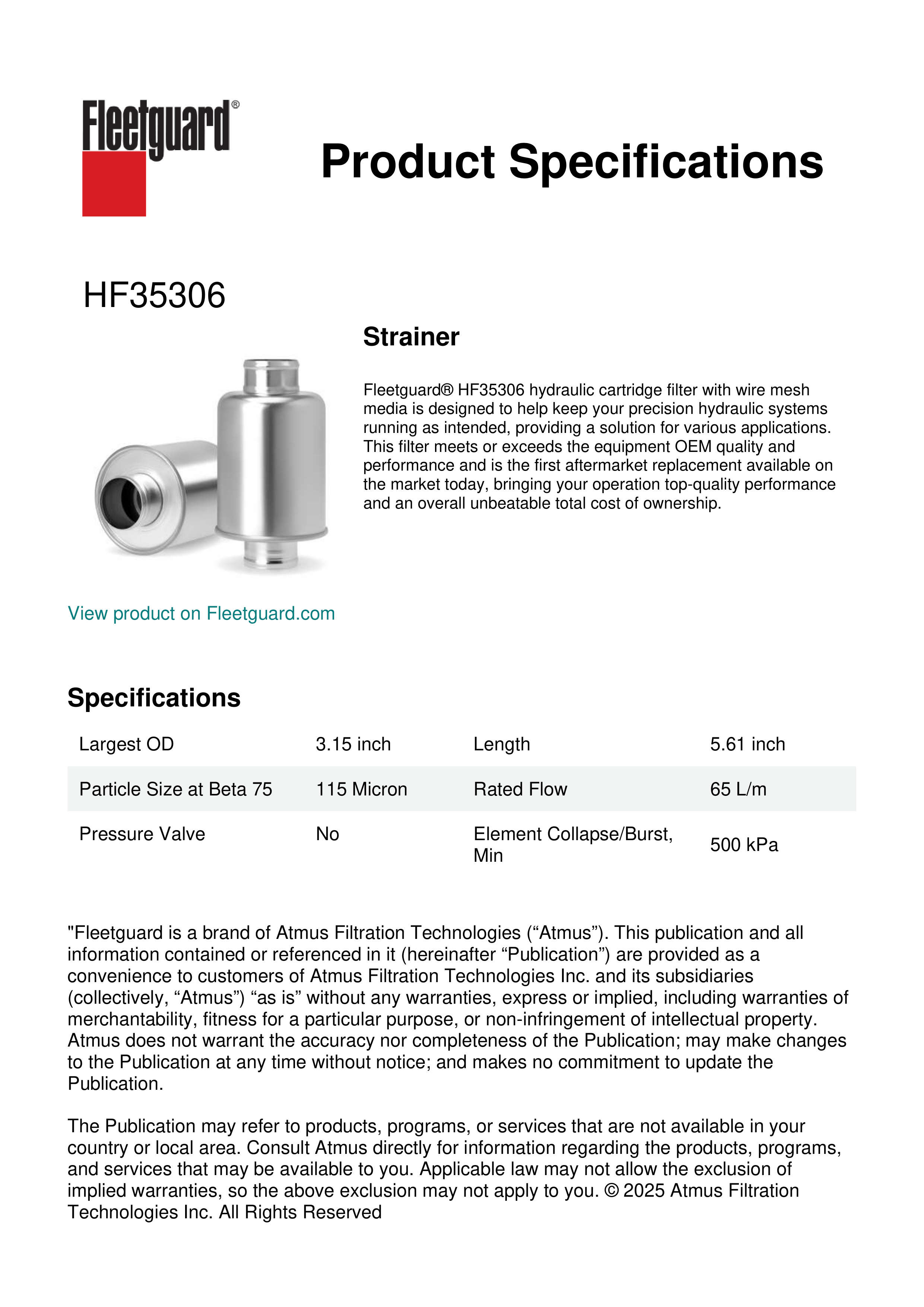 Fleetguard® HF35306 hydraulic cartridge filter with wire mesh media is designed to help keep your precision hydraulic systems running as intended, providing a solution for various applications. This filter meets or exceeds the equipment OEM quality and performance and is the first aftermarket replacement available on the market today, bringing your operation top-quality performance and an overall unbeatable total cost of ownership.Specification