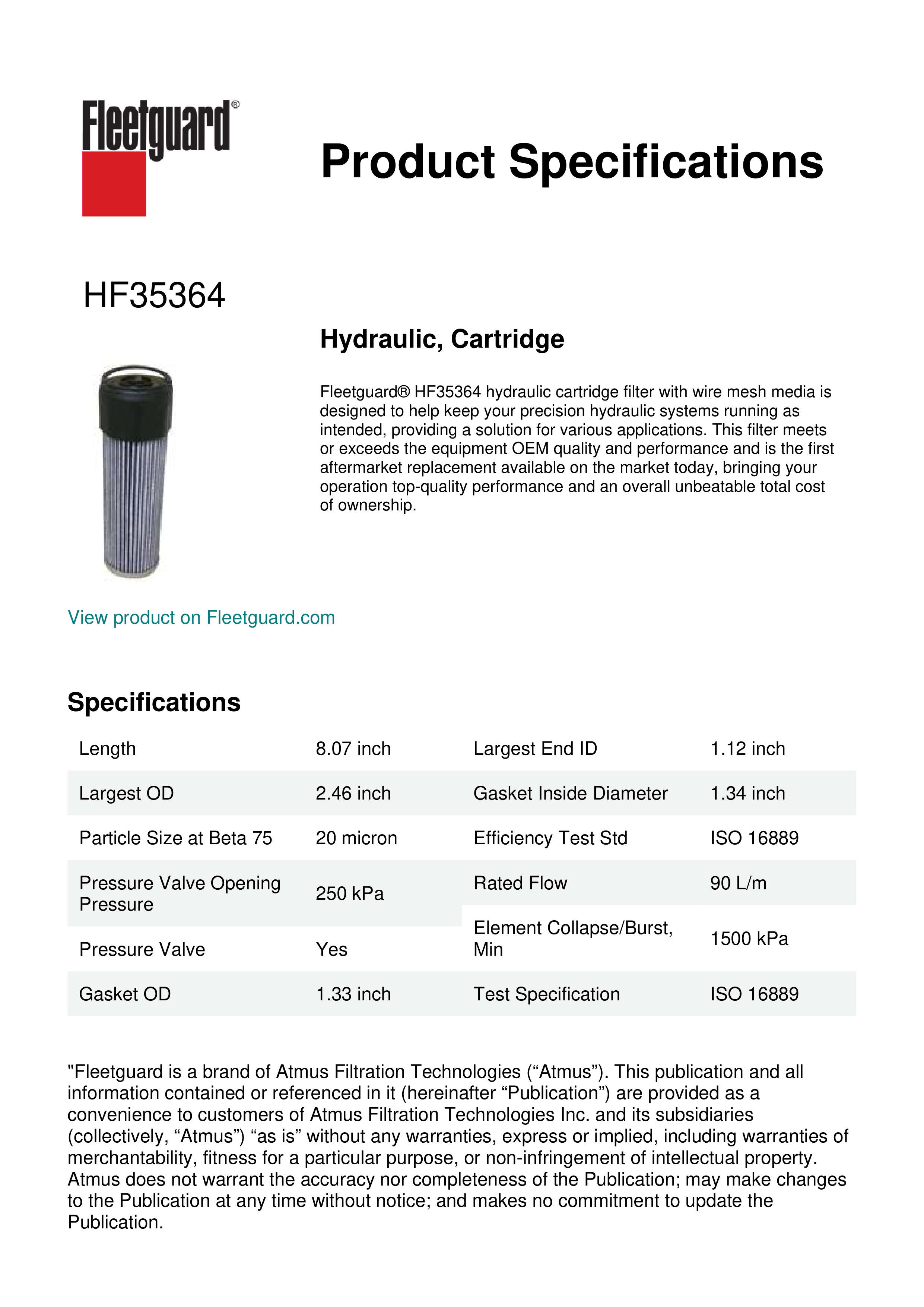 Fleetguard® HF35364 hydraulic cartridge filter with wire mesh media is designed to help keep your precision hydraulic systems running as intended, providing a solution for various applications. This filter meets or exceeds the equipment OEM quality and performance and is the first aftermarket replacement available on the market today, bringing your operation top-quality performance and an overall unbeatable total cost of ownership.Specification
