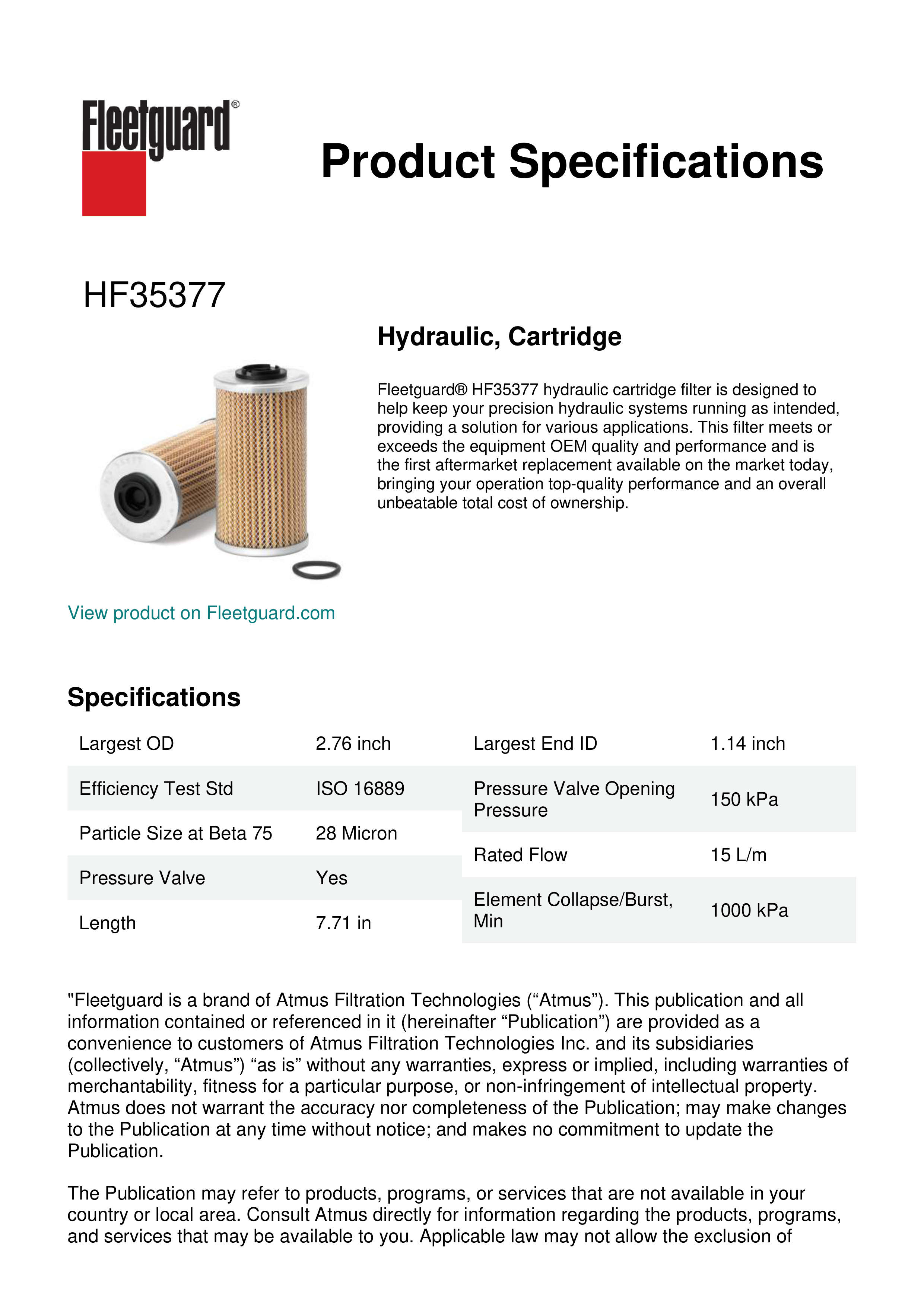Fleetguard® HF35377 hydraulic cartridge filter is designed to help keep your precision hydraulic systems running as intended, providing a solution for various applications. This filter meets or exceeds the equipment OEM quality and performance and is the first aftermarket replacement available on the market today, bringing your operation top-quality performance and an overall unbeatable total cost of ownership.Specification