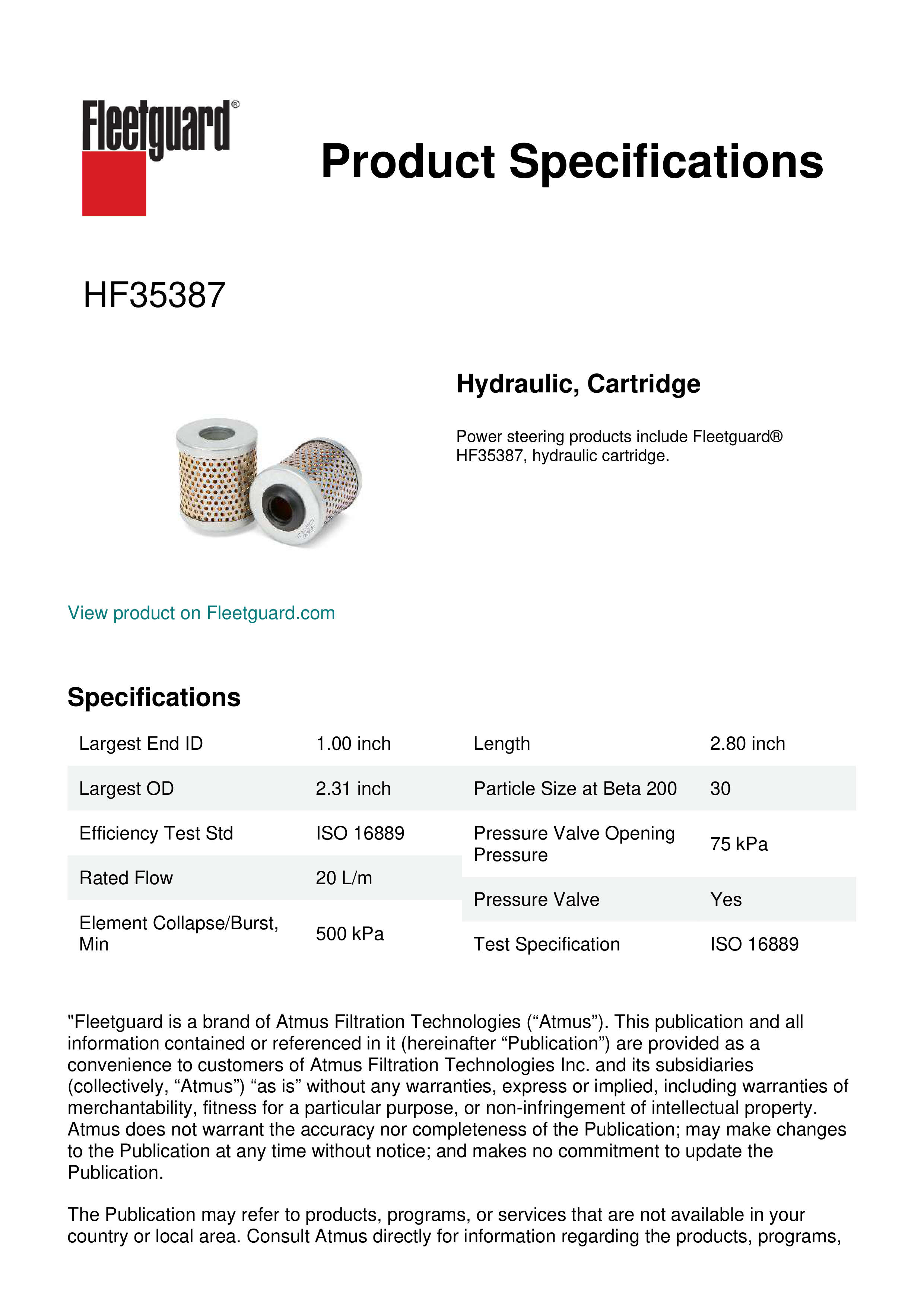 Power steering products include Fleetguard® HF35387, hydraulic cartridge.Specification