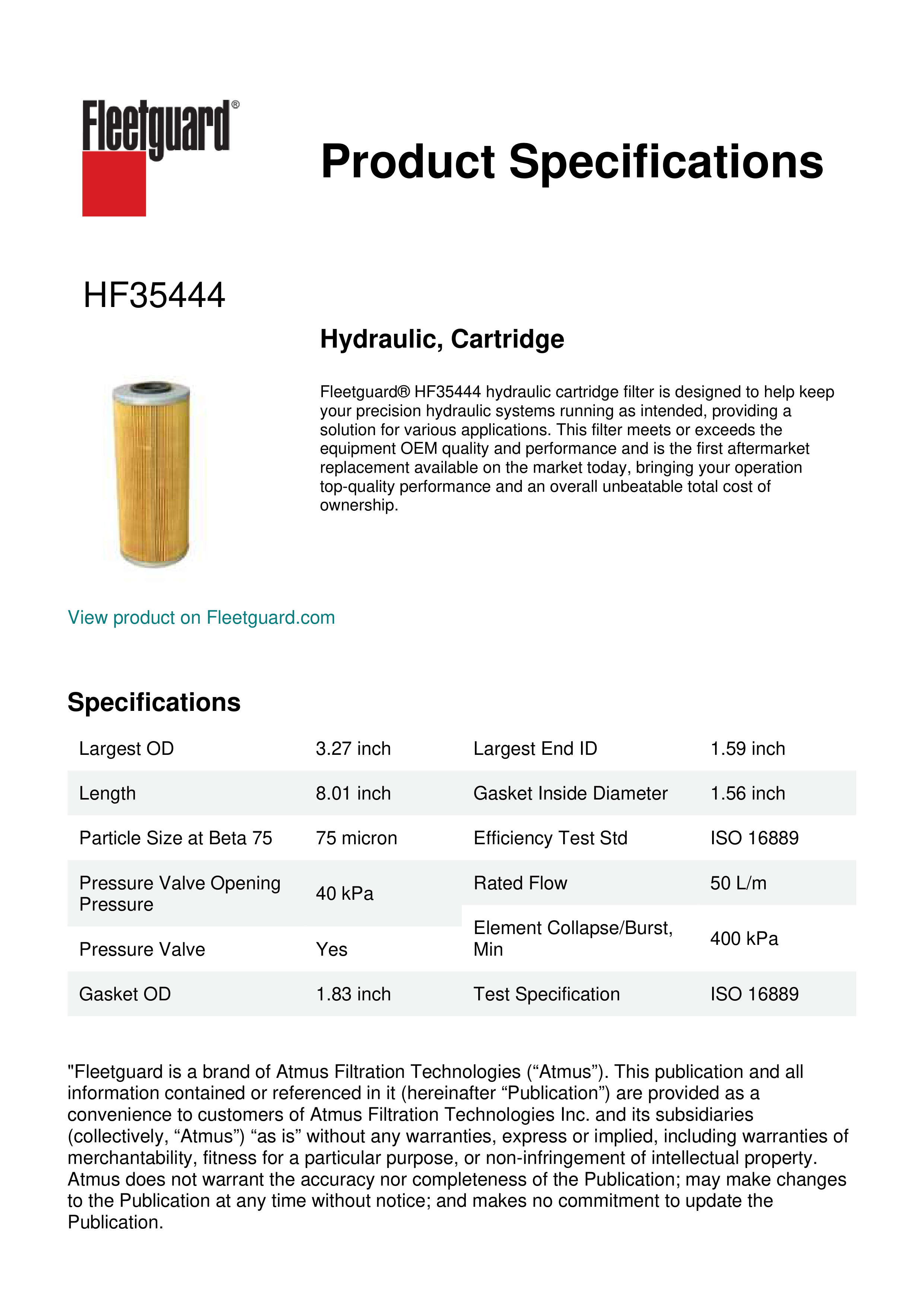 Fleetguard® HF35444 hydraulic cartridge filter is designed to help keep your precision hydraulic systems running as intended, providing a solution for various applications. This filter meets or exceeds the equipment OEM quality and performance and is the first aftermarket replacement available on the market today, bringing your operation top-quality performance and an overall unbeatable total cost of ownership.Specification
