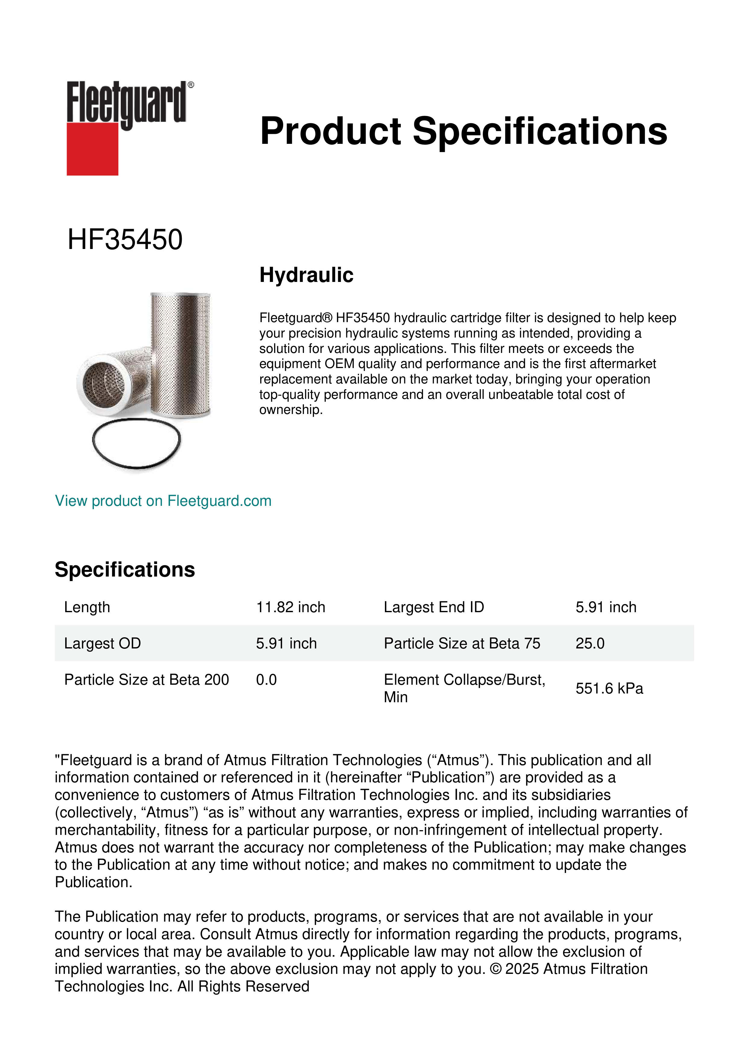 Fleetguard® HF35450 hydraulic cartridge filter is designed to help keep your precision hydraulic systems running as intended, providing a solution for various applications. This filter meets or exceeds the equipment OEM quality and performance and is the first aftermarket replacement available on the market today, bringing your operation top-quality performance and an overall unbeatable total cost of ownership.Specification