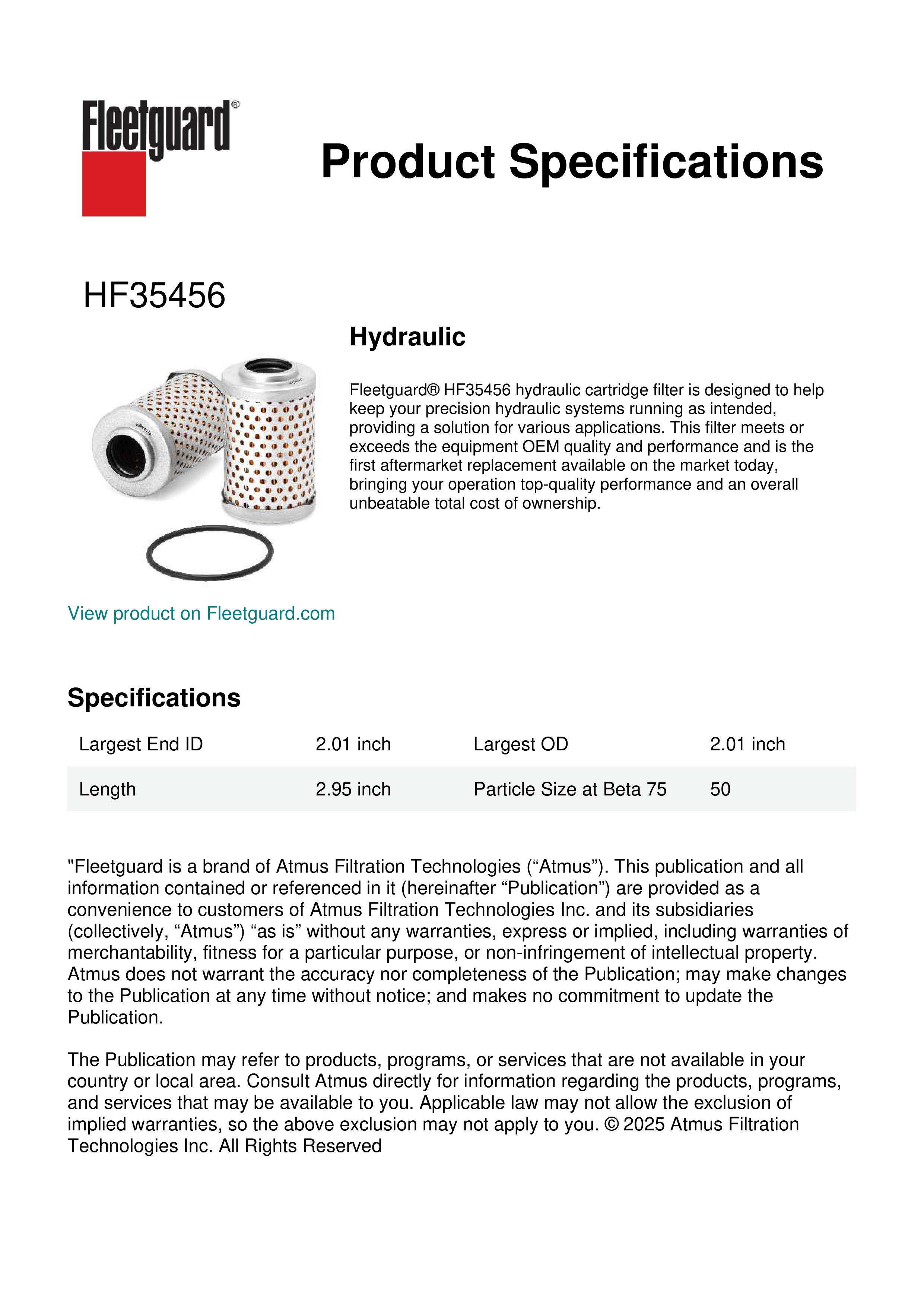 Fleetguard® HF35456 hydraulic cartridge filter is designed to help keep your precision hydraulic systems running as intended, providing a solution for various applications. This filter meets or exceeds the equipment OEM quality and performance and is the first aftermarket replacement available on the market today, bringing your operation top-quality performance and an overall unbeatable total cost of ownership.Specification