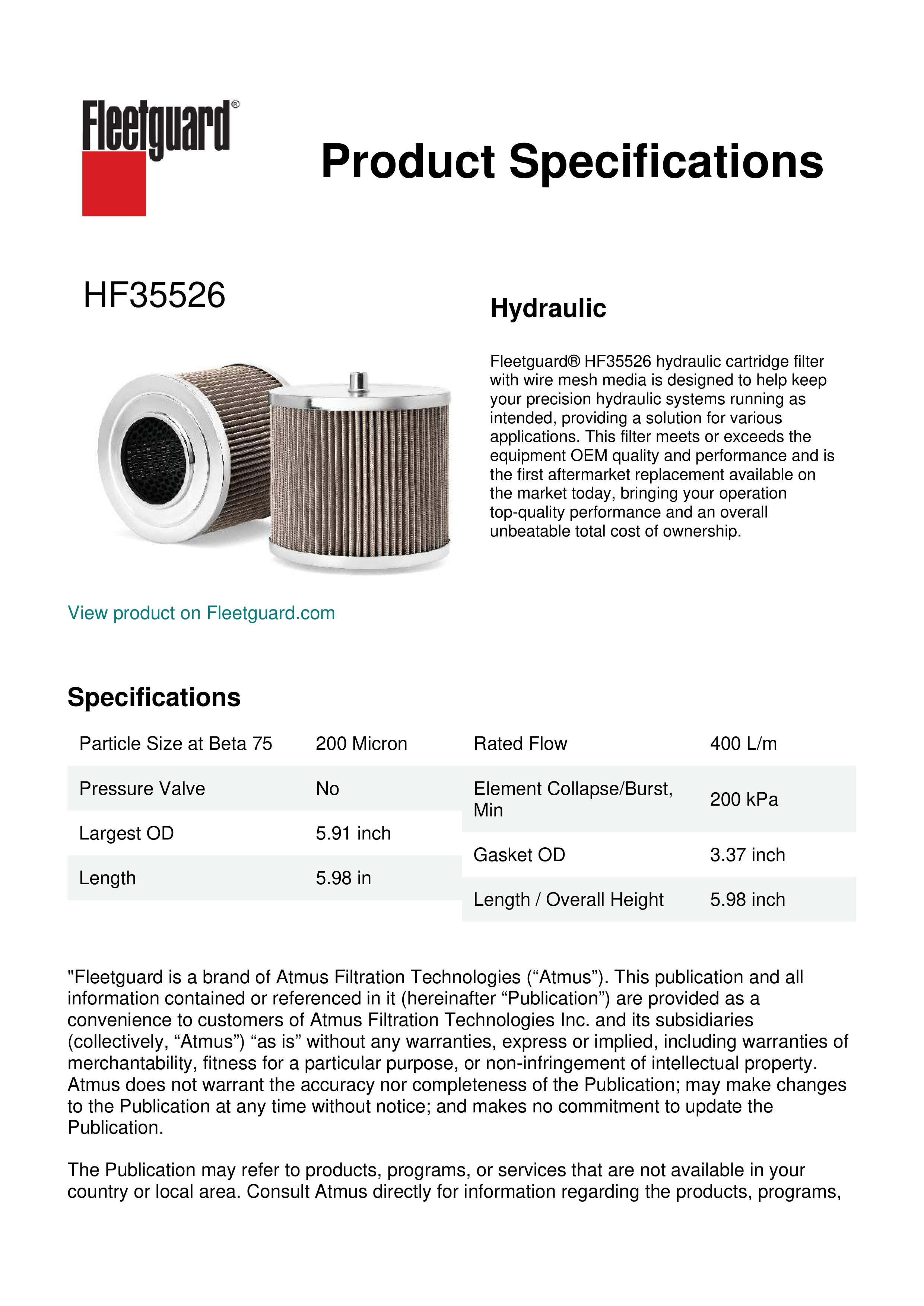 Fleetguard® HF35526 hydraulic cartridge filter with wire mesh media is designed to help keep your precision hydraulic systems running as intended, providing a solution for various applications. This filter meets or exceeds the equipment OEM quality and performance and is the first aftermarket replacement available on the market today, bringing your operation top-quality performance and an overall unbeatable total cost of ownership.Specification